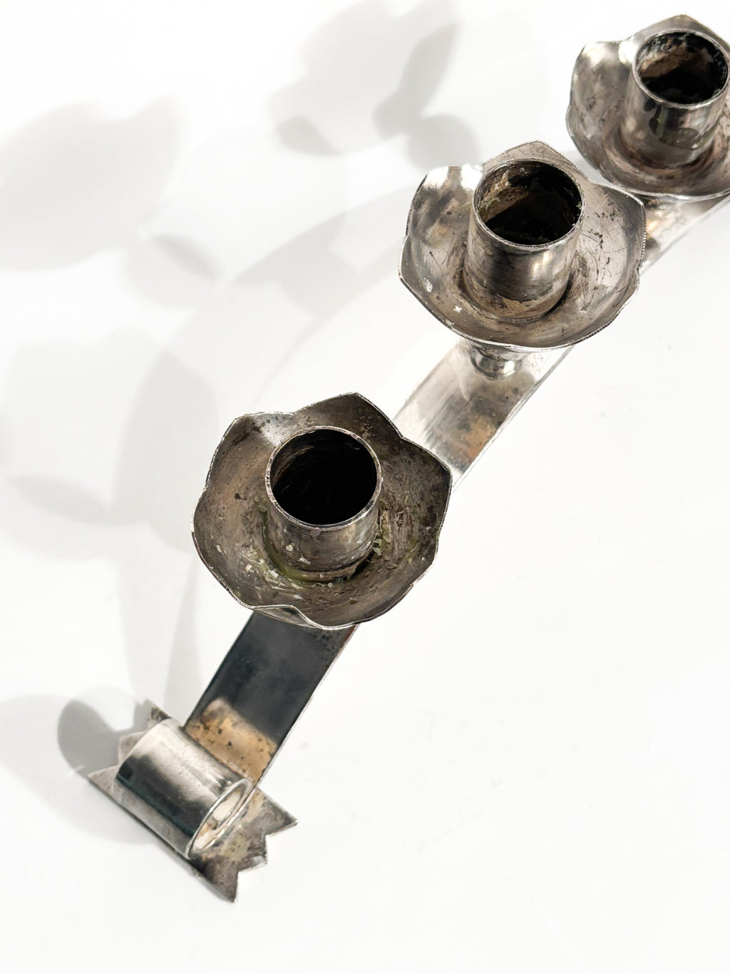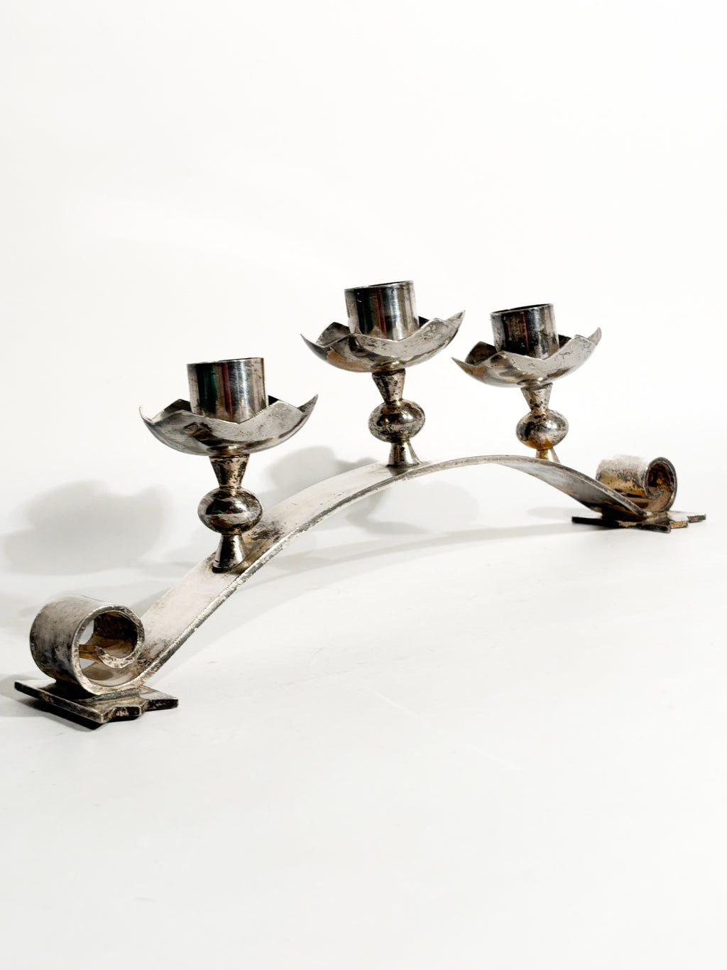 Portacandele triplo in metallo argentato, realizzato in Italia negli anni '50