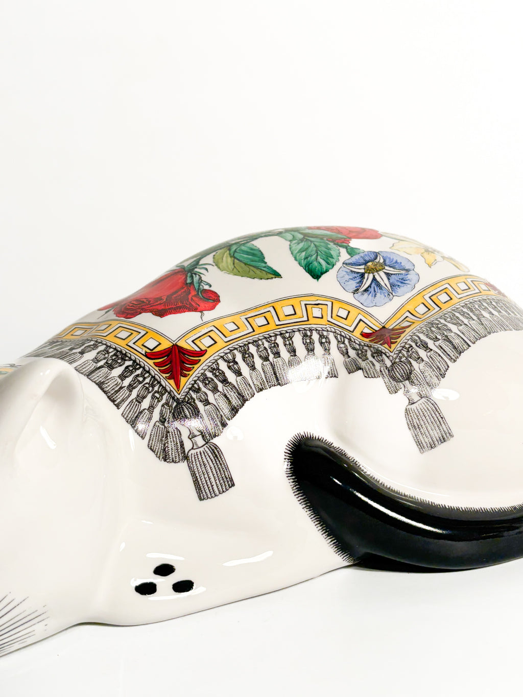 Il Gatto Mantellato è un pezzo da collezione molto ambito, originariamente introdotto negli anni '50 da Piero Fornasetti. La scultura è realizzata in ceramica smaltata e decorata a mano con motivi floreali policromi. Eventuali lievi discrepanze tra pezzi simili sono dovuti alla produzione artigianale, che rende ogni oggetto unico.