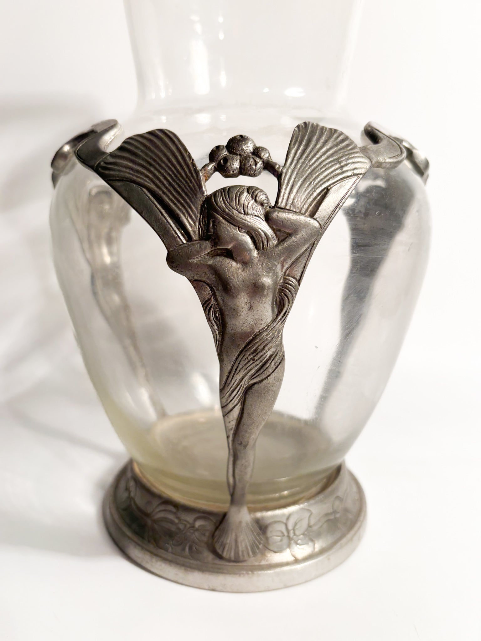 Liberty vase in transparent glass and pewter carved with ladies, made in the early 20th century