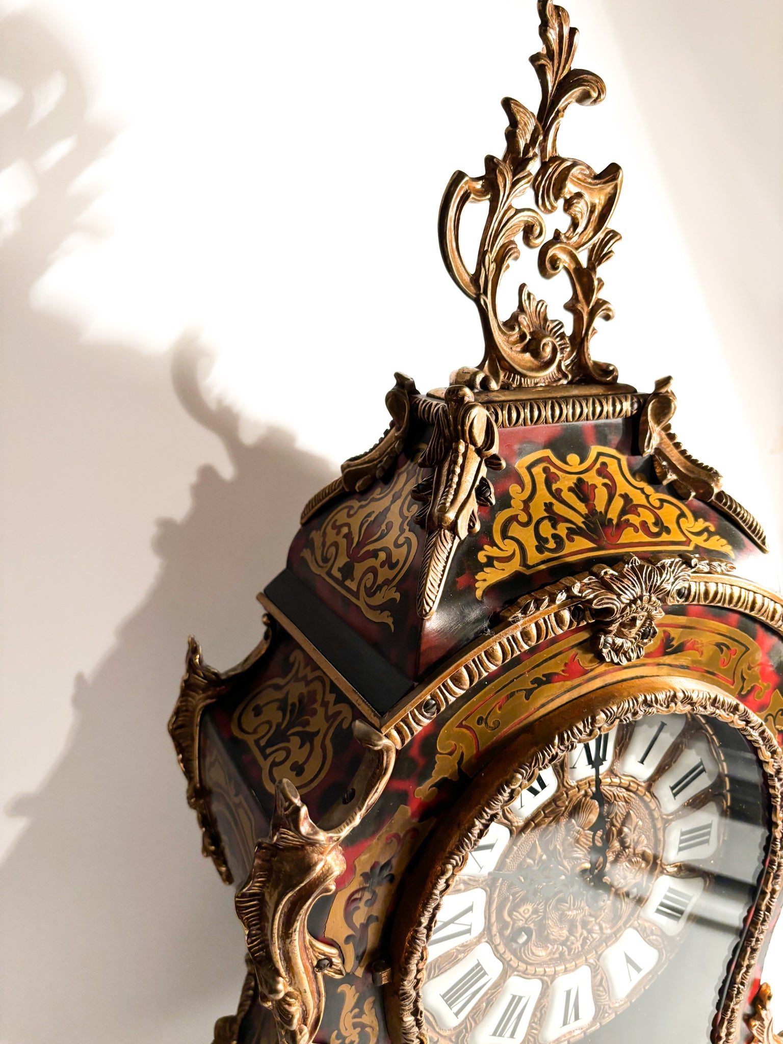 Boulle clocks were typically made in France during the 18th and 19th centuries and are known for their ornate design elements. The clocks feature intricate designs created by inlaying brass, tortoiseshell or other decorative materials onto a wooden surface. Inlaid patterns often include geometric shapes, floral motifs, and elaborate scrollwork, creating a luxurious and opulent look.