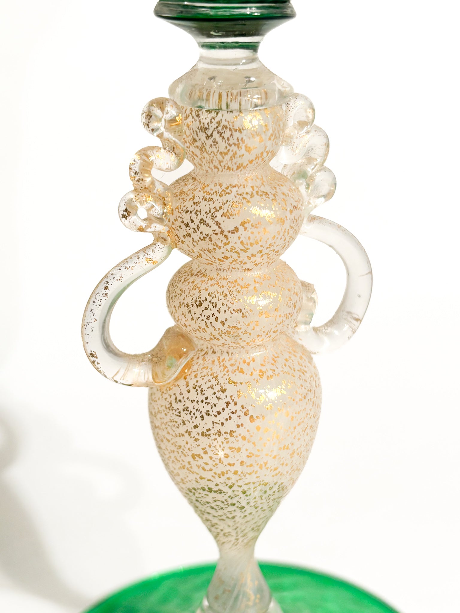 Calice in Vetro di Murano Soffiato a Mano Verde e Foglia d'Oro Anni 70