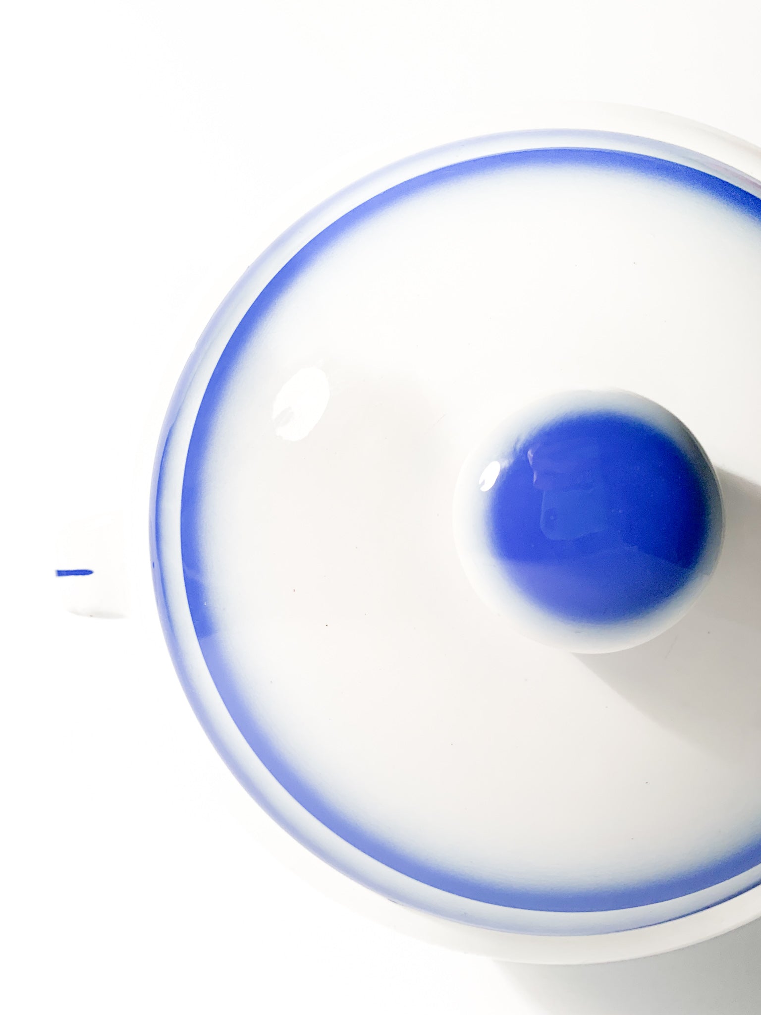 Centerpiece / tureen in white ceramic and blue stripes, made by Galvani Pordenone in the 1950s