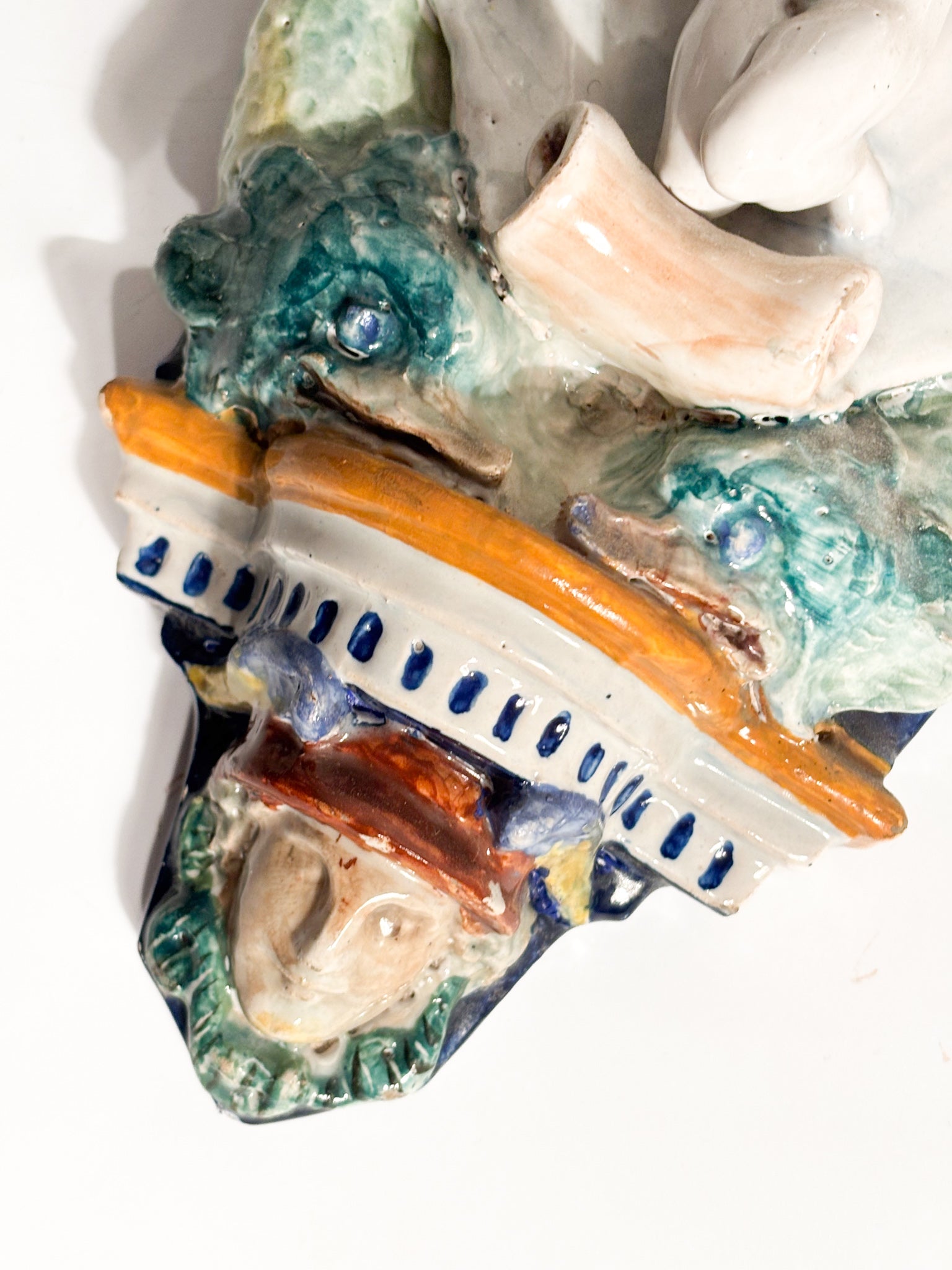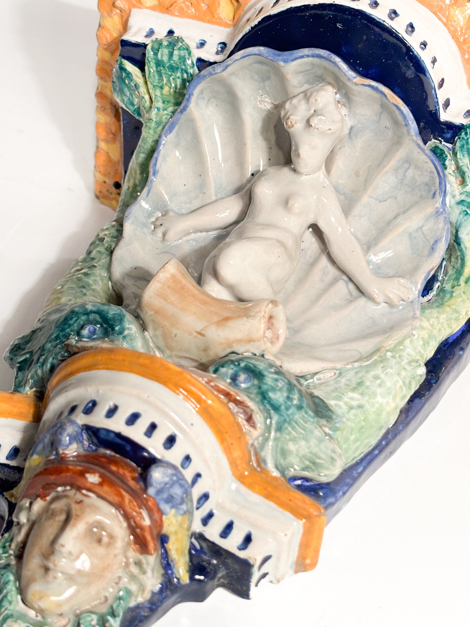 Hand-painted Faenza ceramic wall shelf, with shell and lady, made in the early years of the 20th century