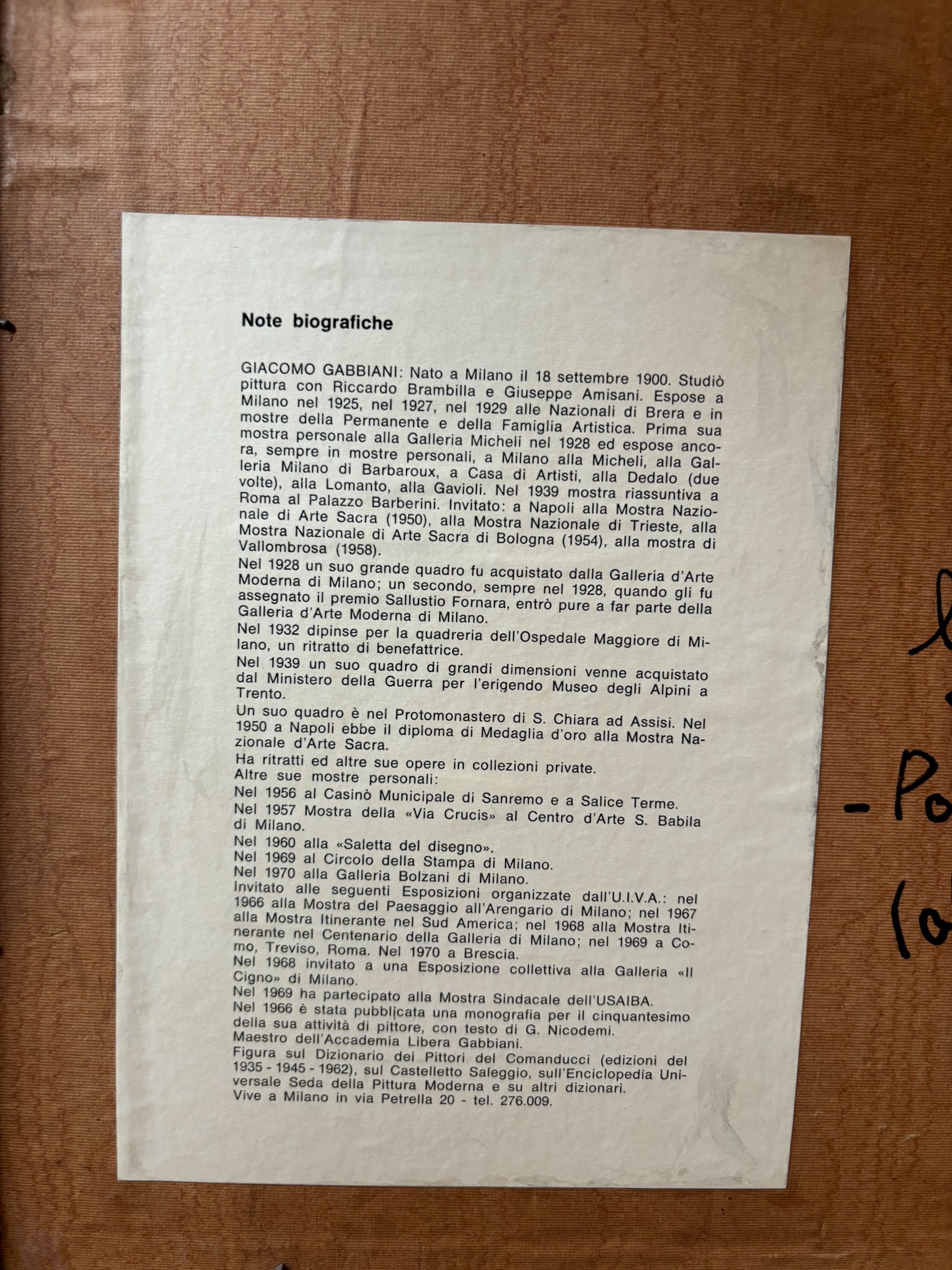 After the war, with the changing taste of the public, however, he remained on the sidelines in the Italian artistic panorama, although he continued to work and exhibit: in Sanremo in 1956, the following year at the Centro San Babila in Milan.
