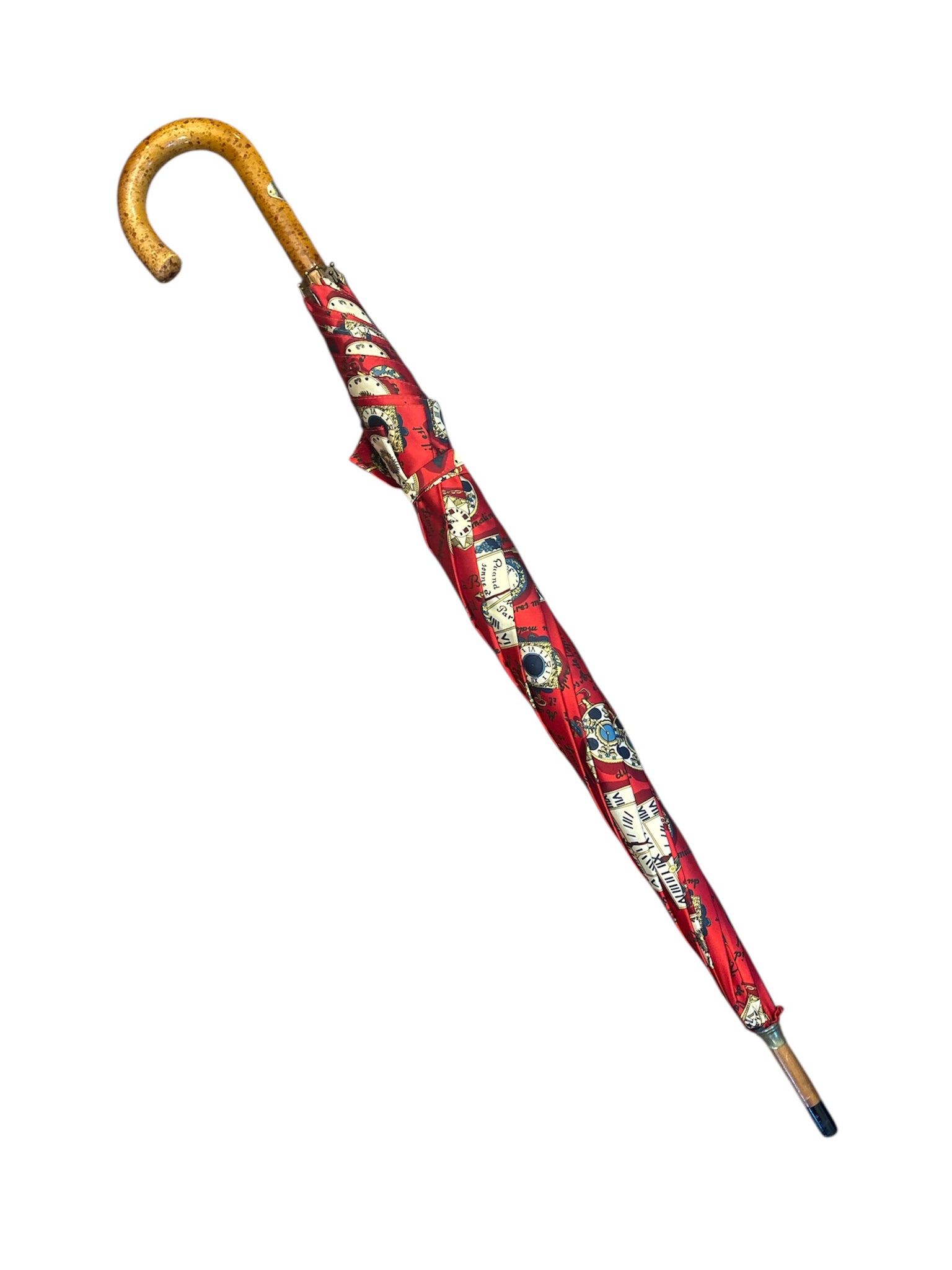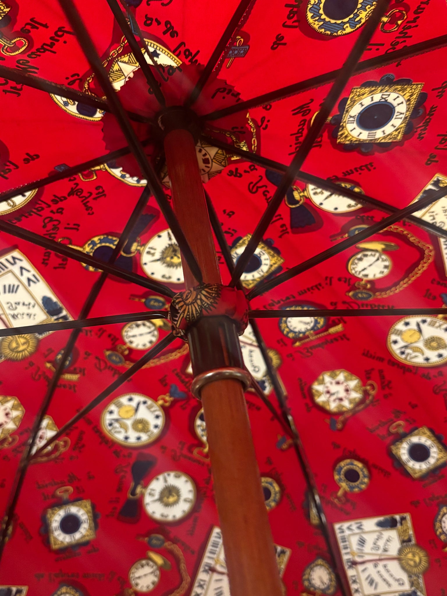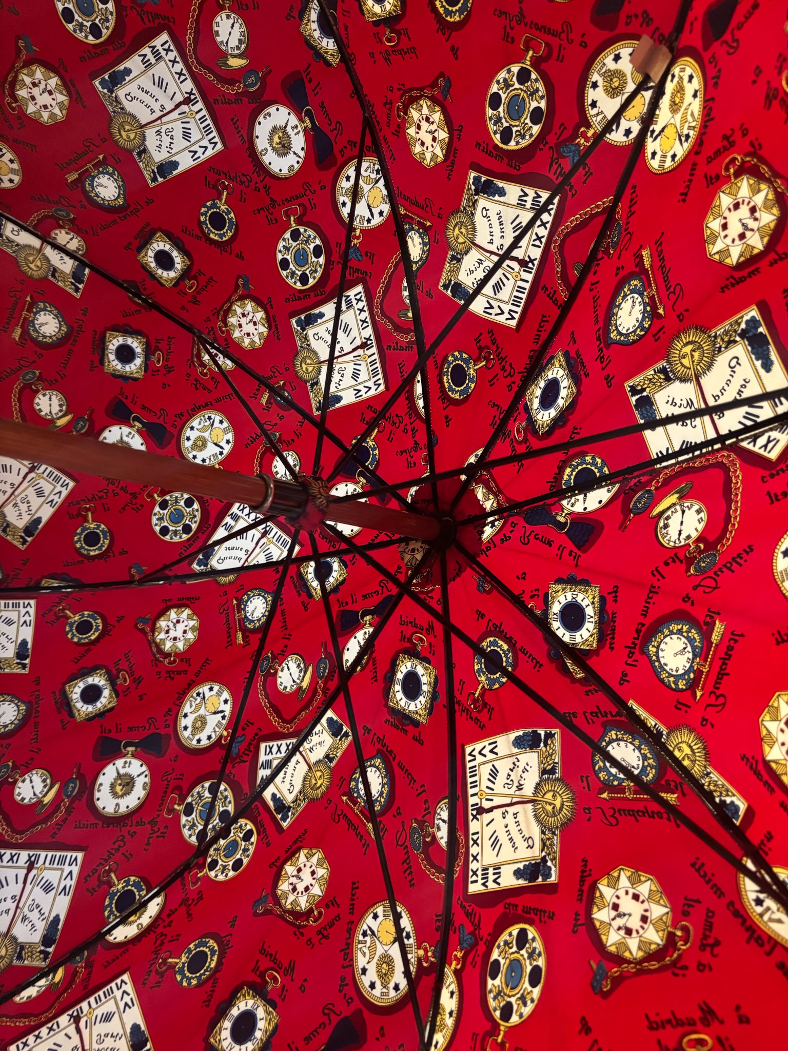 Ombrello di Fornasetti, collezione 'Orologi' rosso, realizzato negli anni '90.