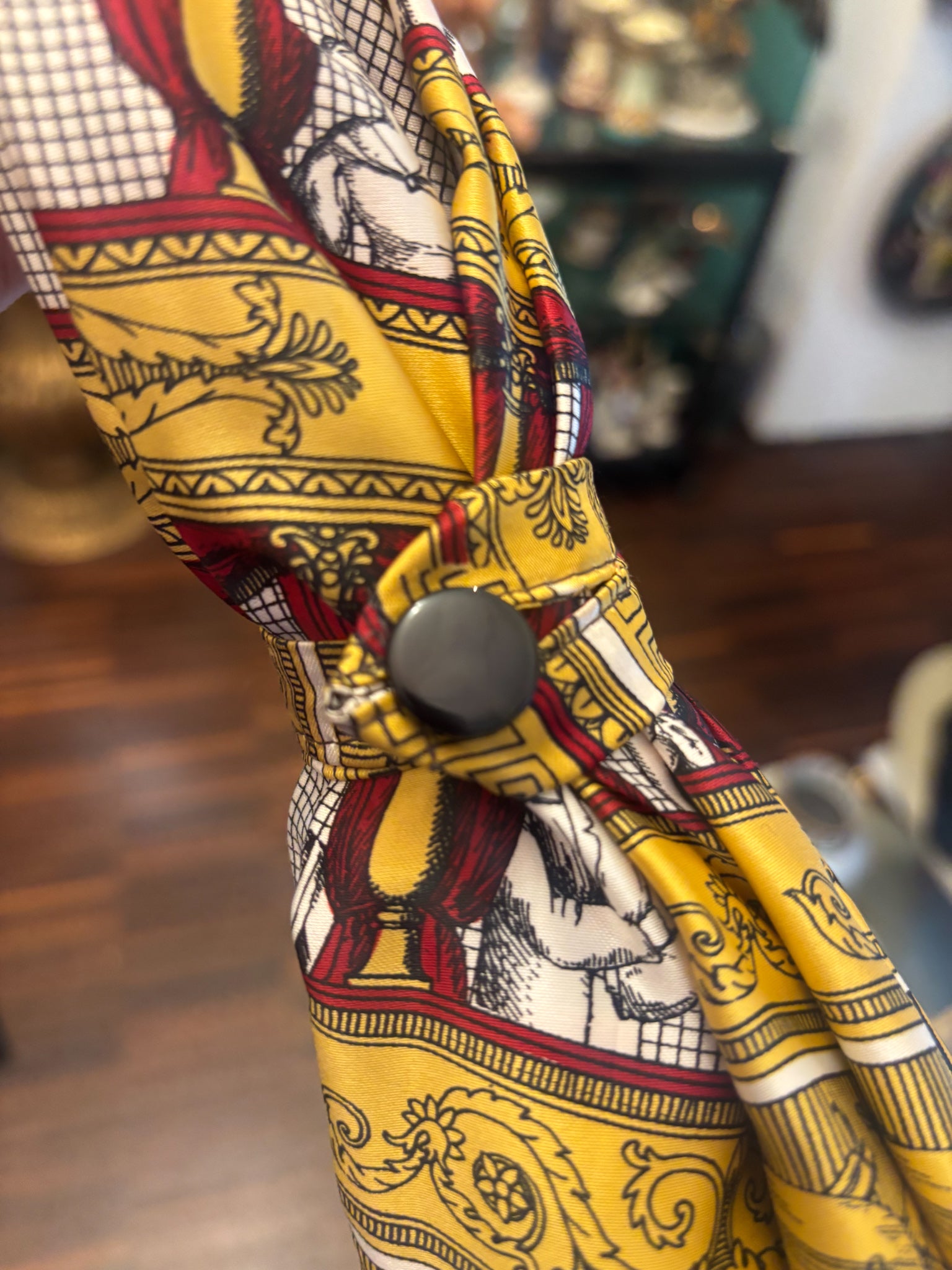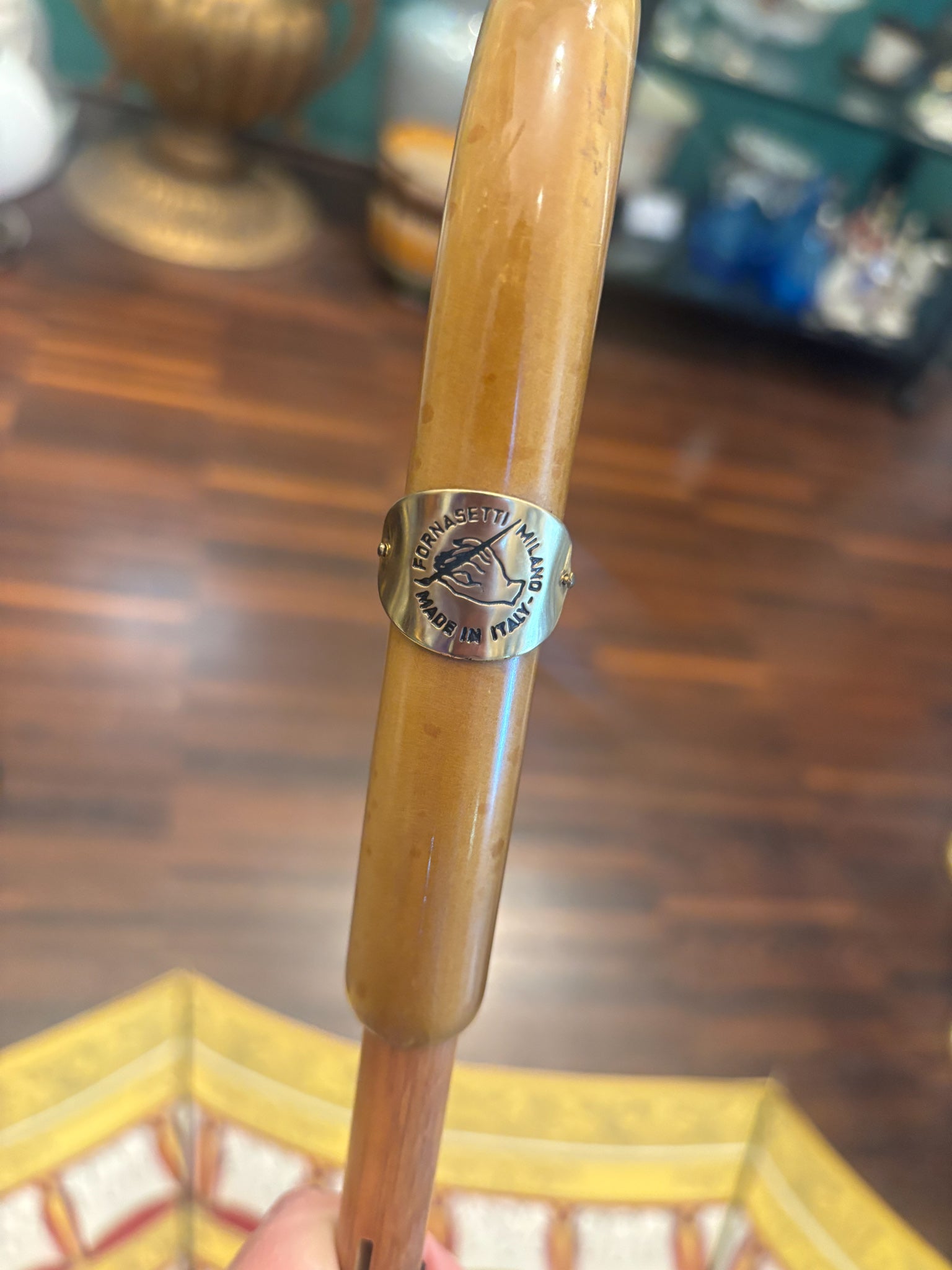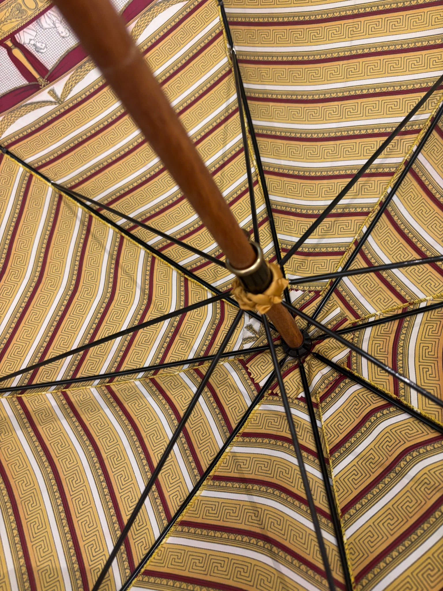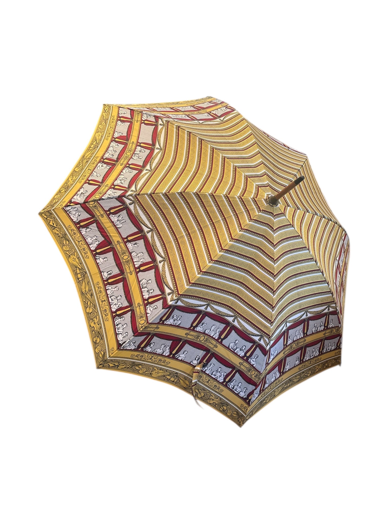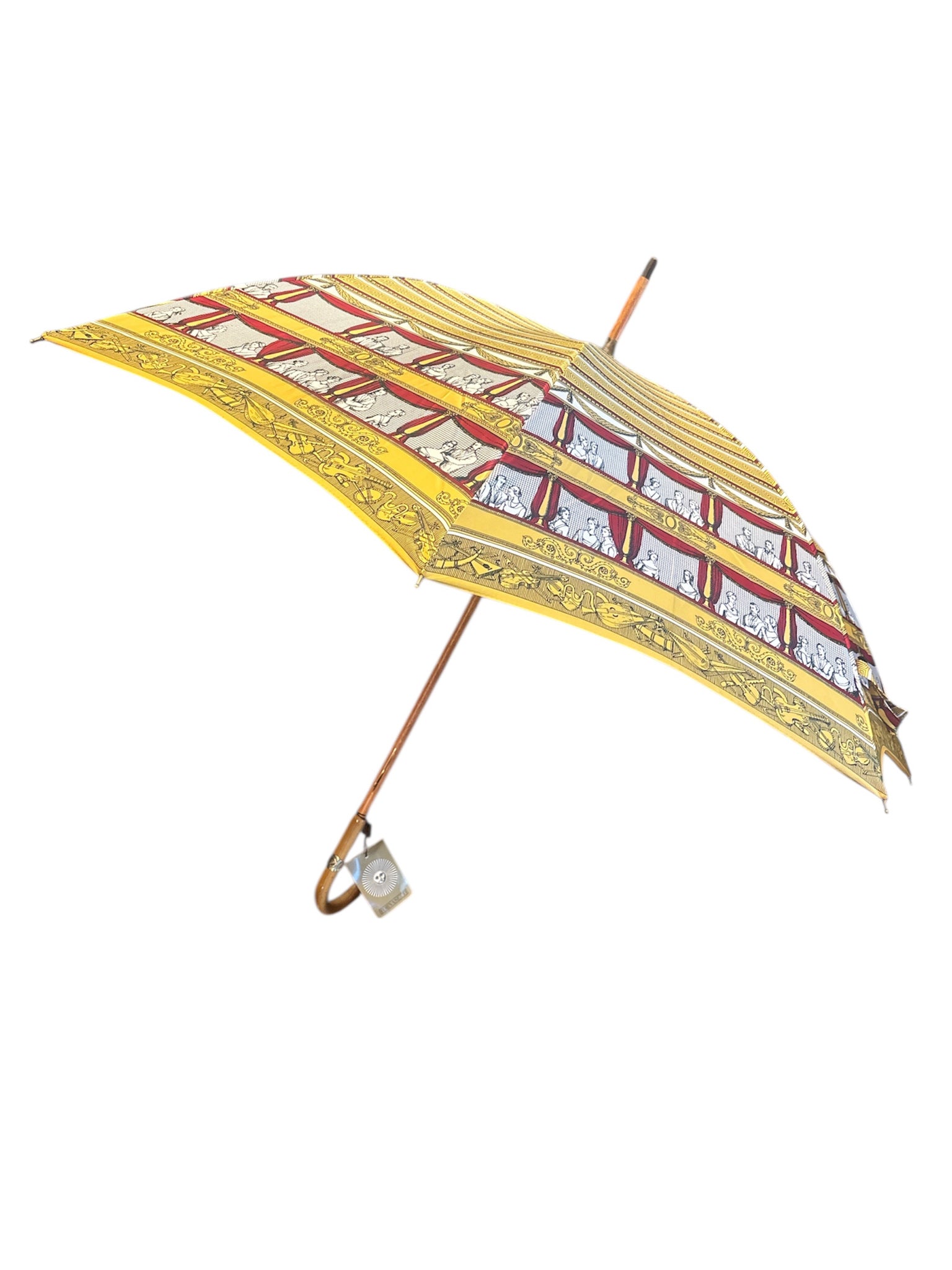 Ombrello di Fornasetti, collezione 'Teatro alla Scala', realizzato negli anni '90. Il manico è realizzato in legno di faggio tinto e i dettagli in ottone.