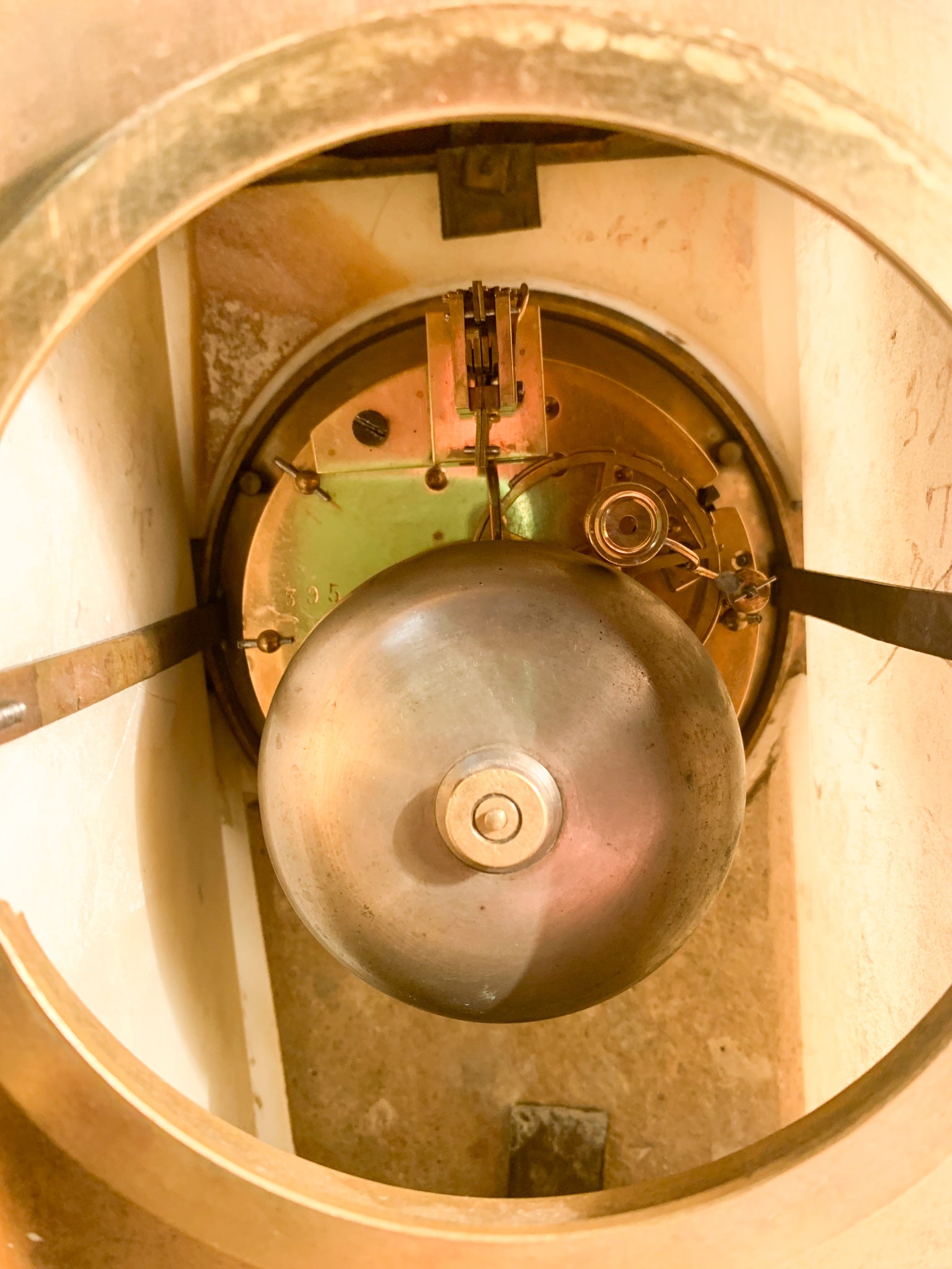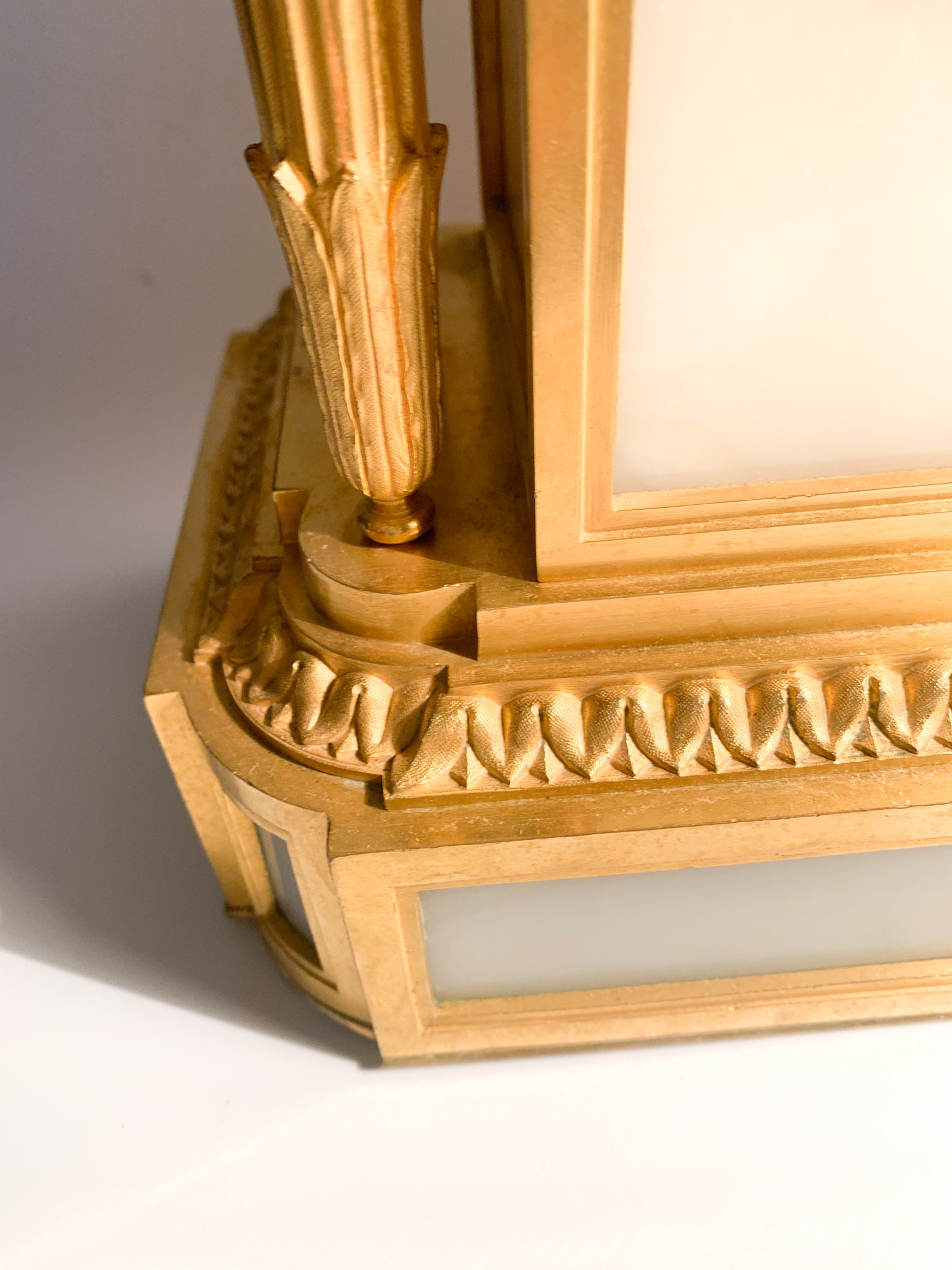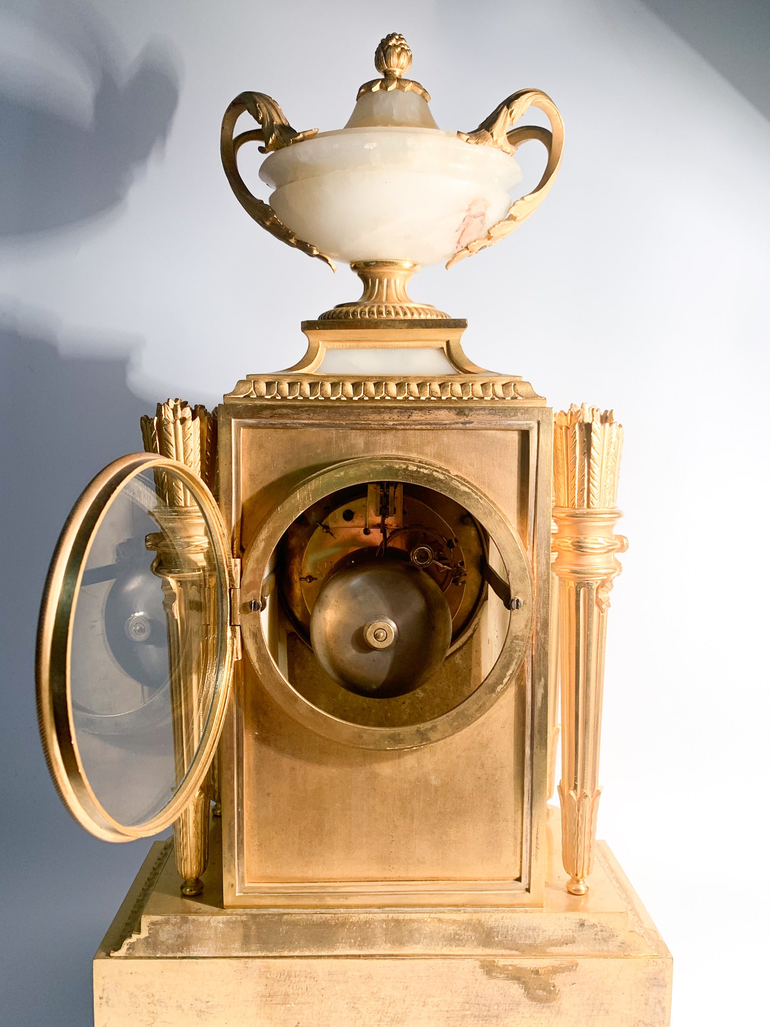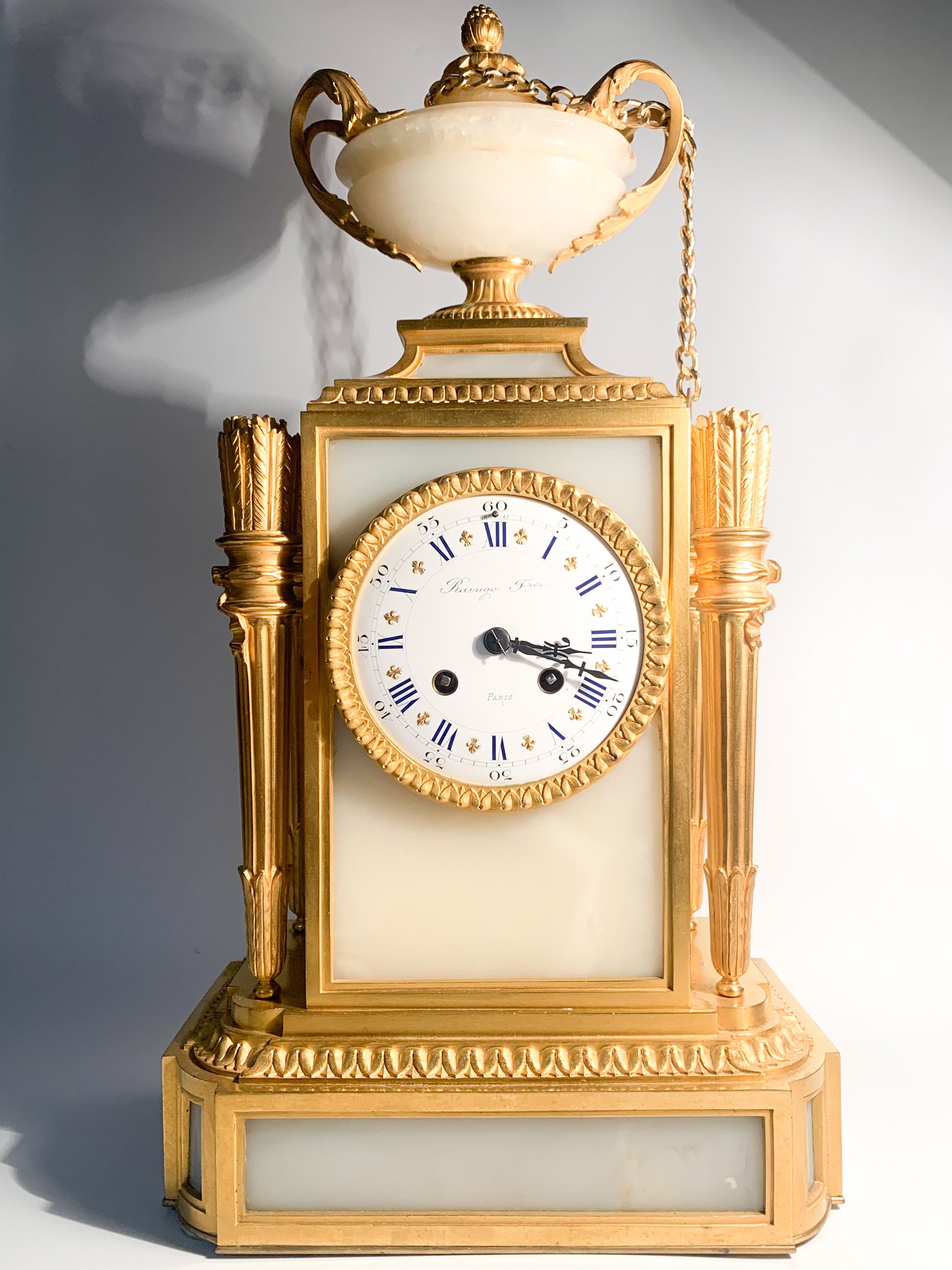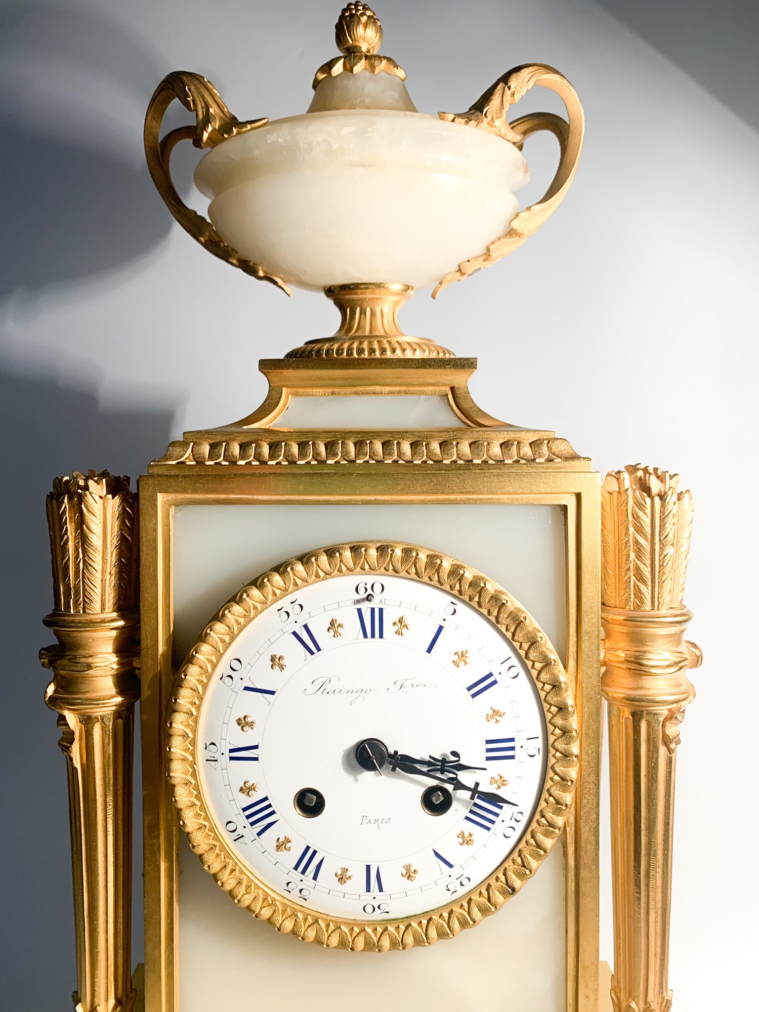 French Louis XVI style table clock in alabaster and gilded bronze, made by Raingo Frères Paris in 1800