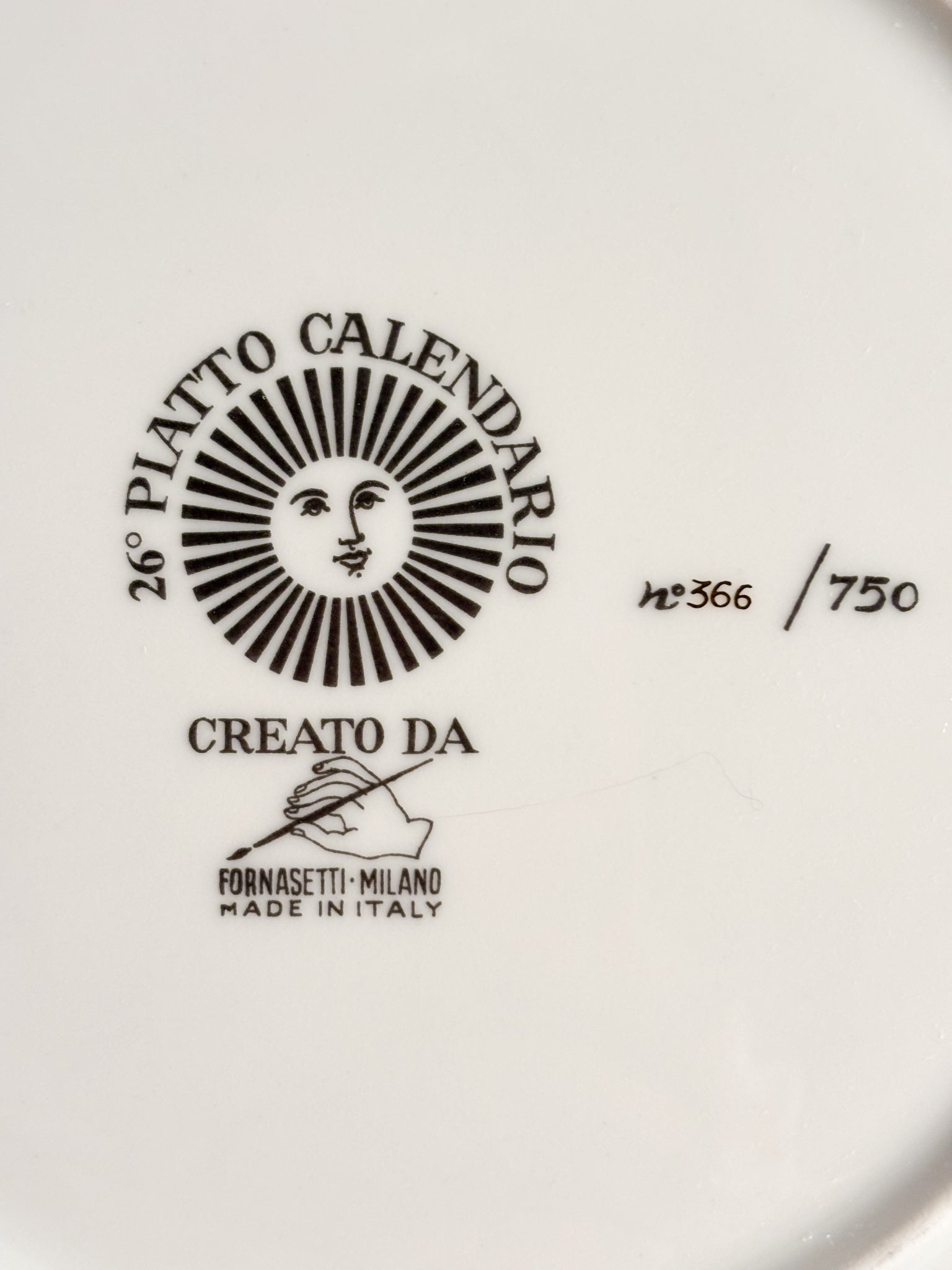 I piatti calendario sono una tradizione Fornasetti dal 1968, originariamente concepiti come strenna natalizia. Ogni piatto riporta i giorni e i mesi dell'anno, con grafiche e decori tipici dell'immaginario Fornasetti, come soli e lune.
