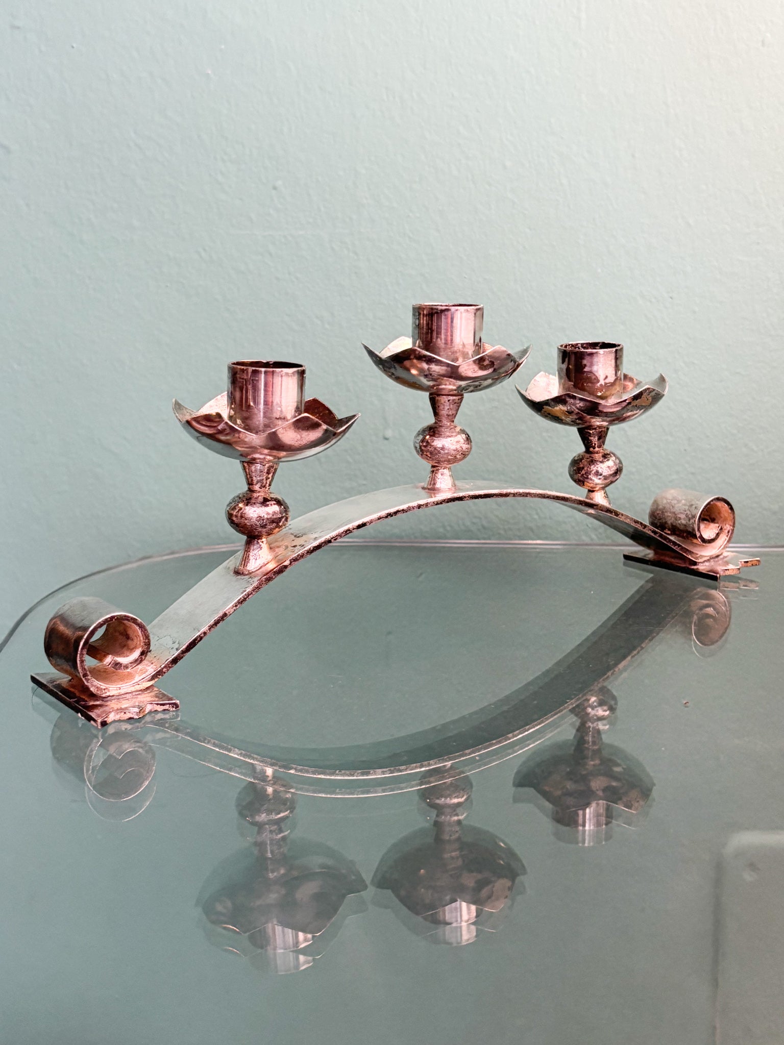 Portacandele Triplo in Metallo Argentato Manifattura Italiana Anni 50