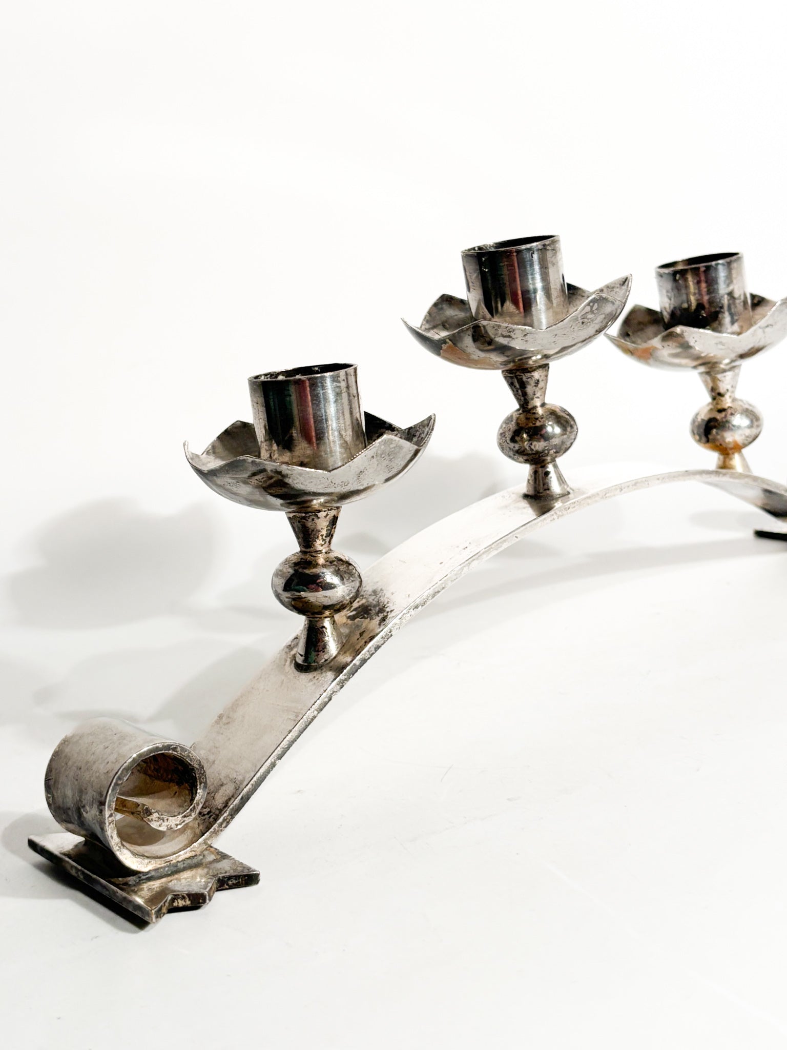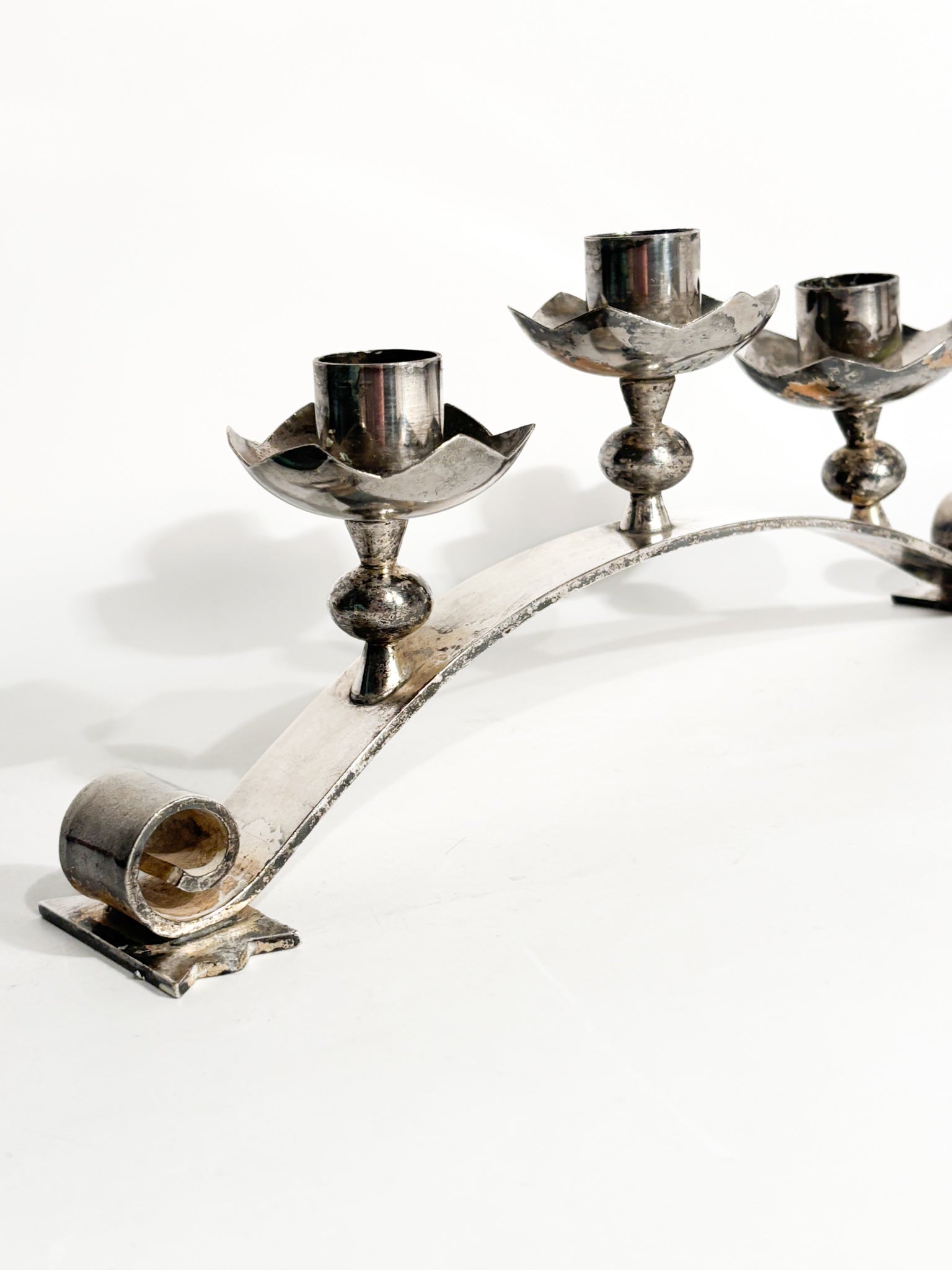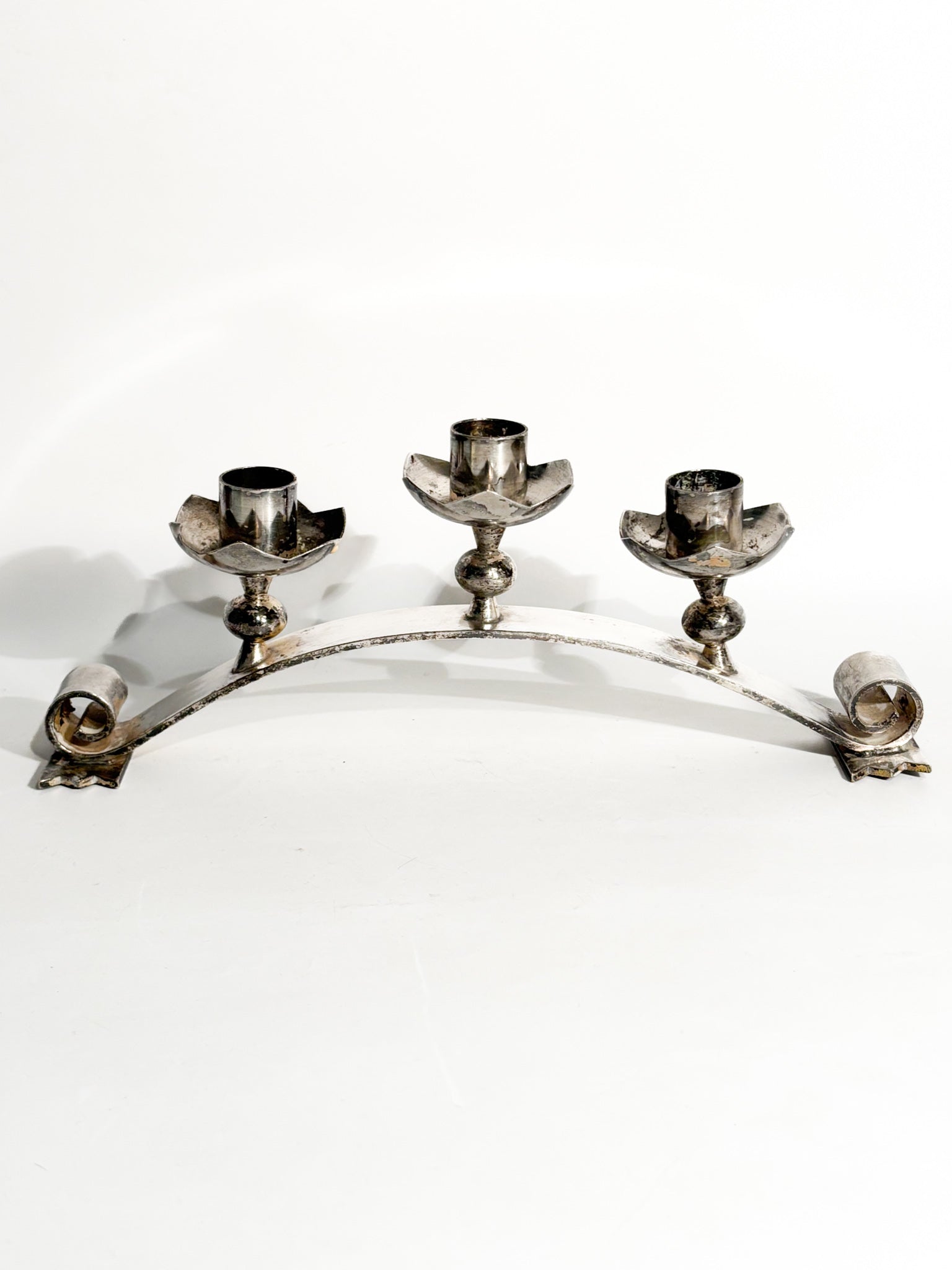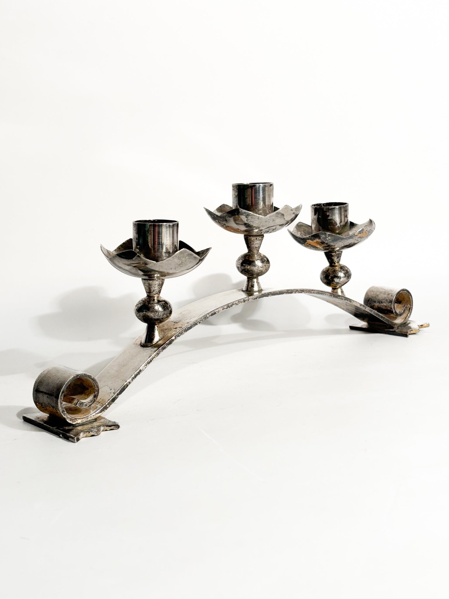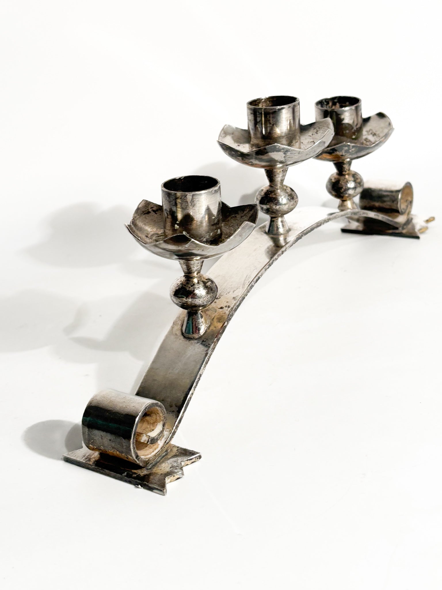 Portacandele triplo in metallo argentato, realizzato in Italia negli anni '50