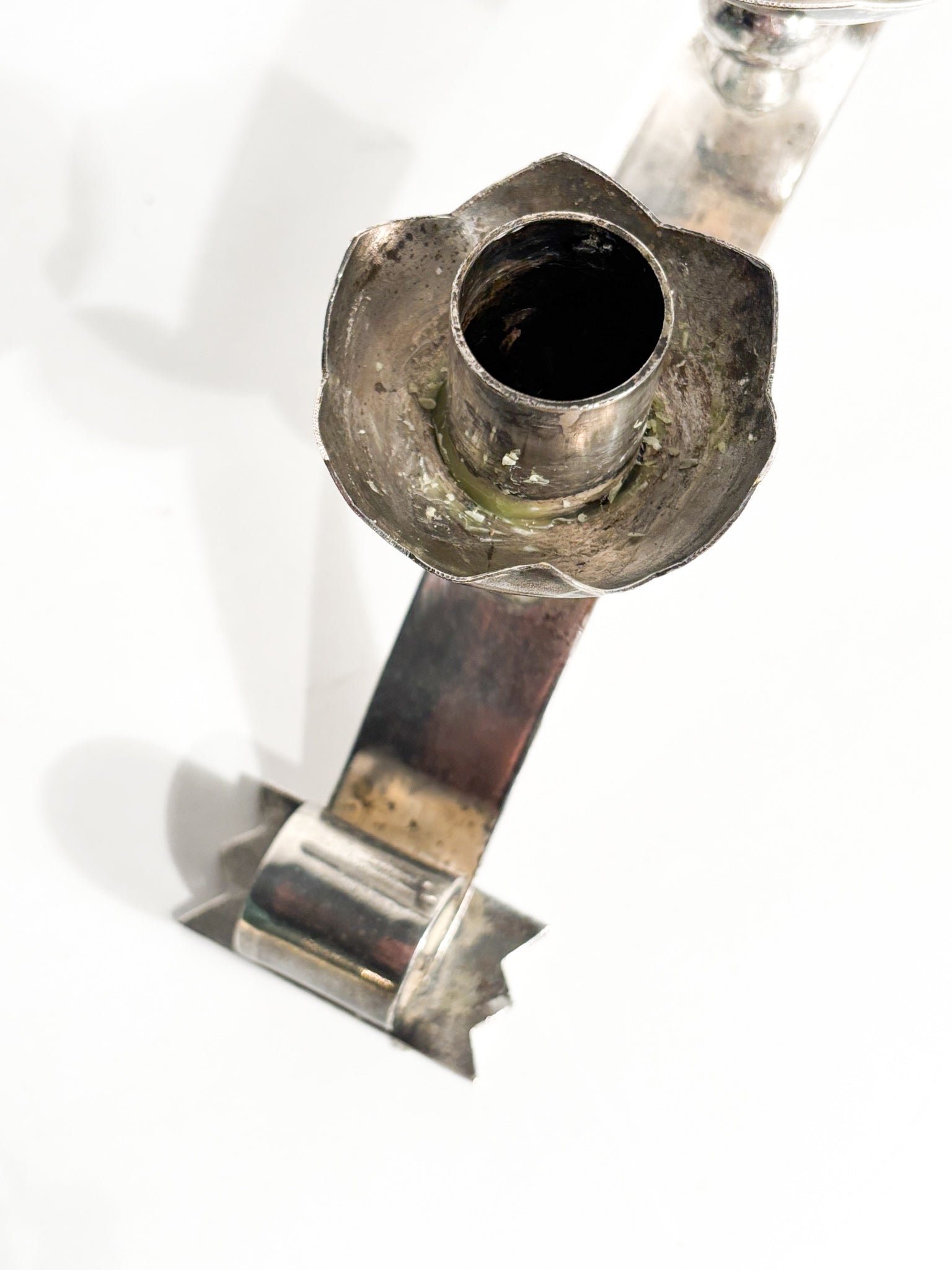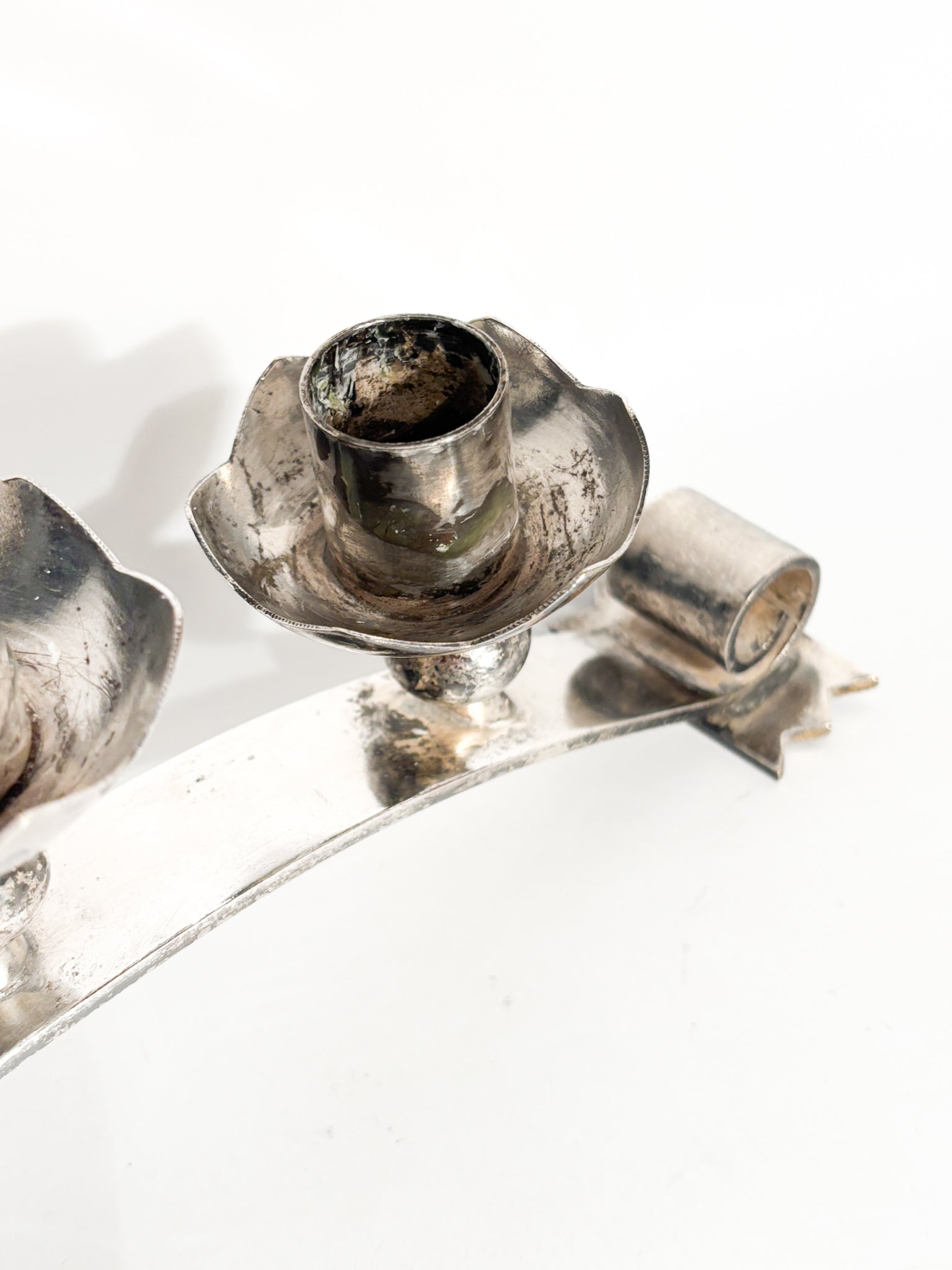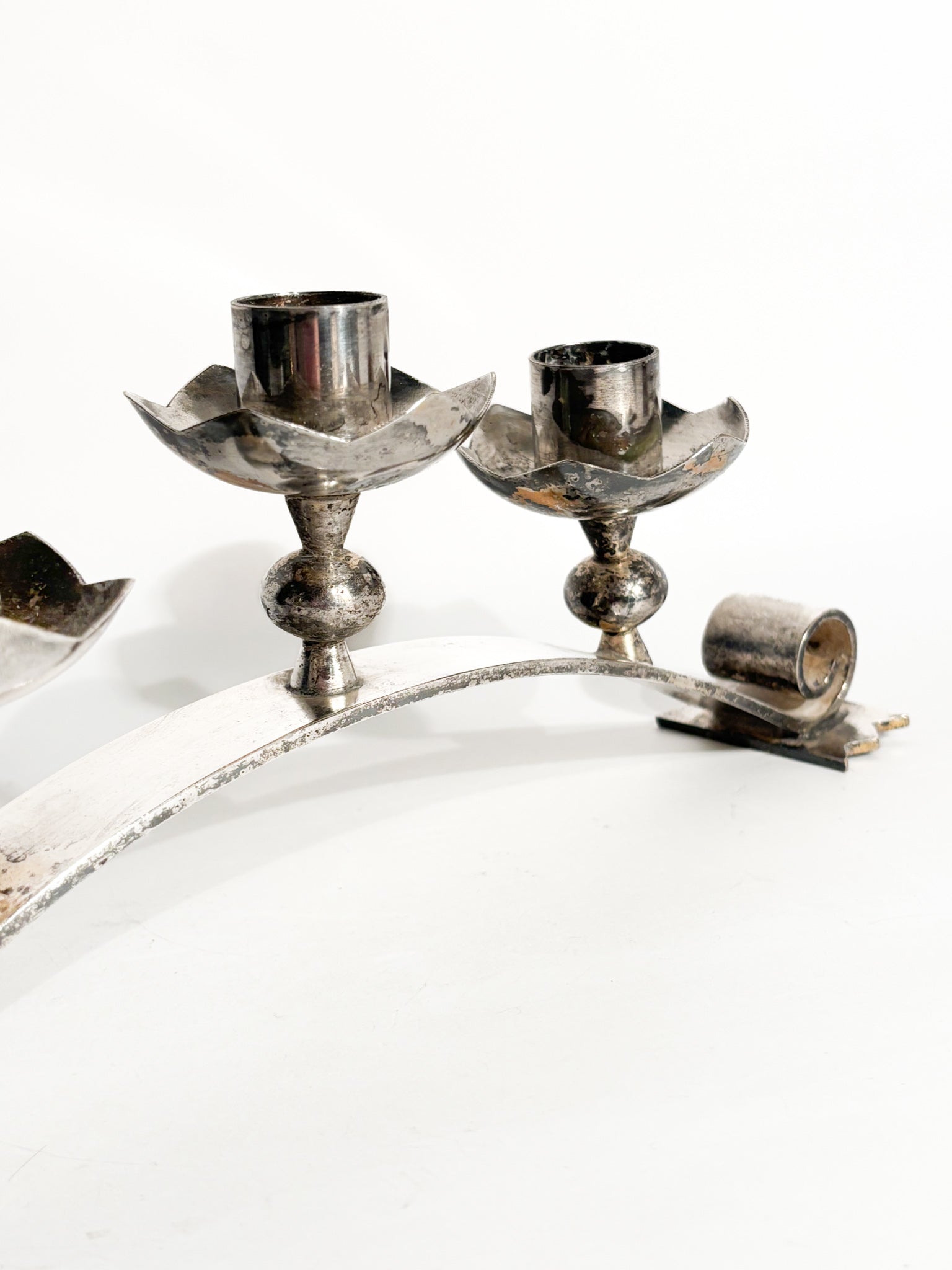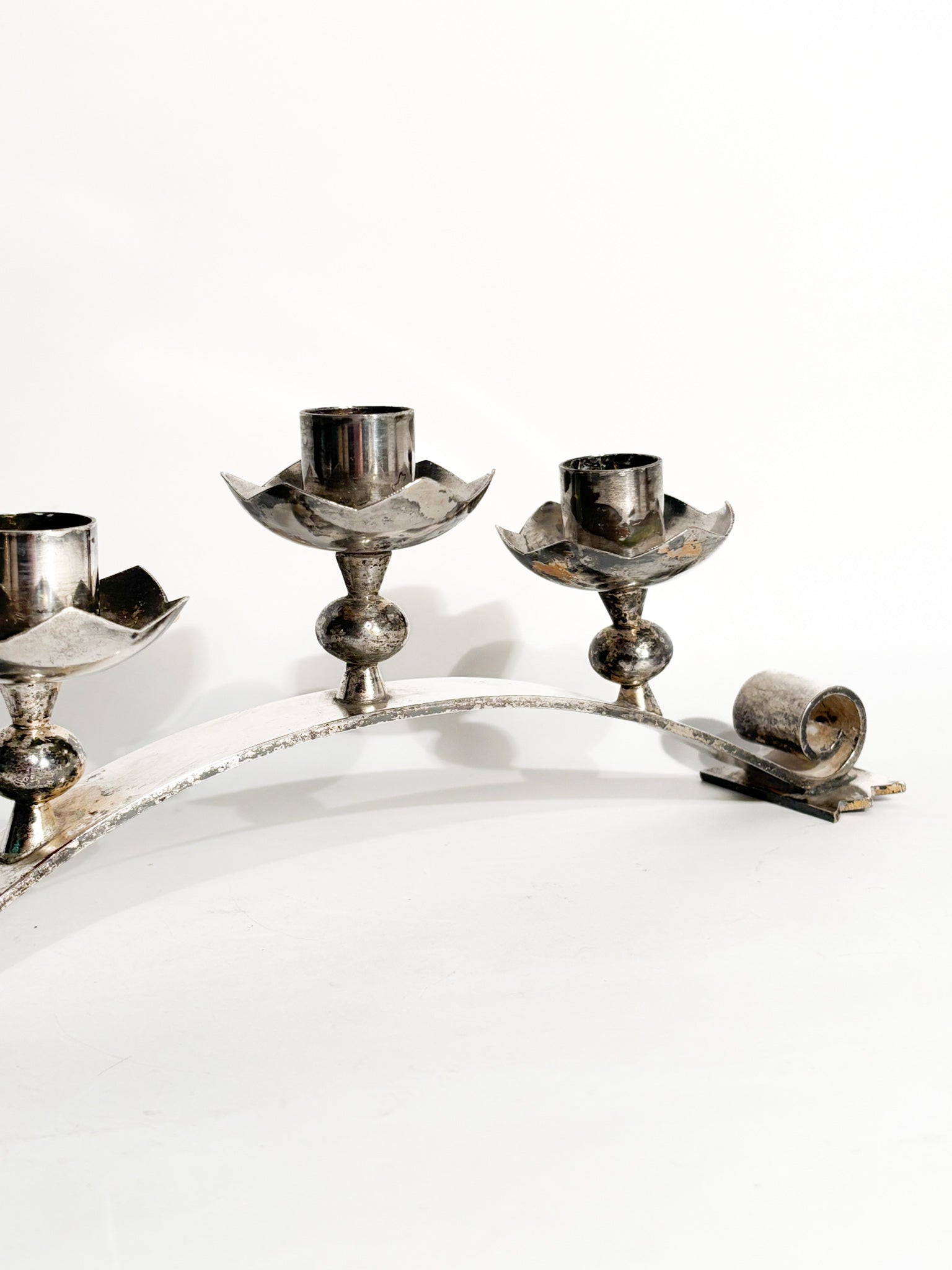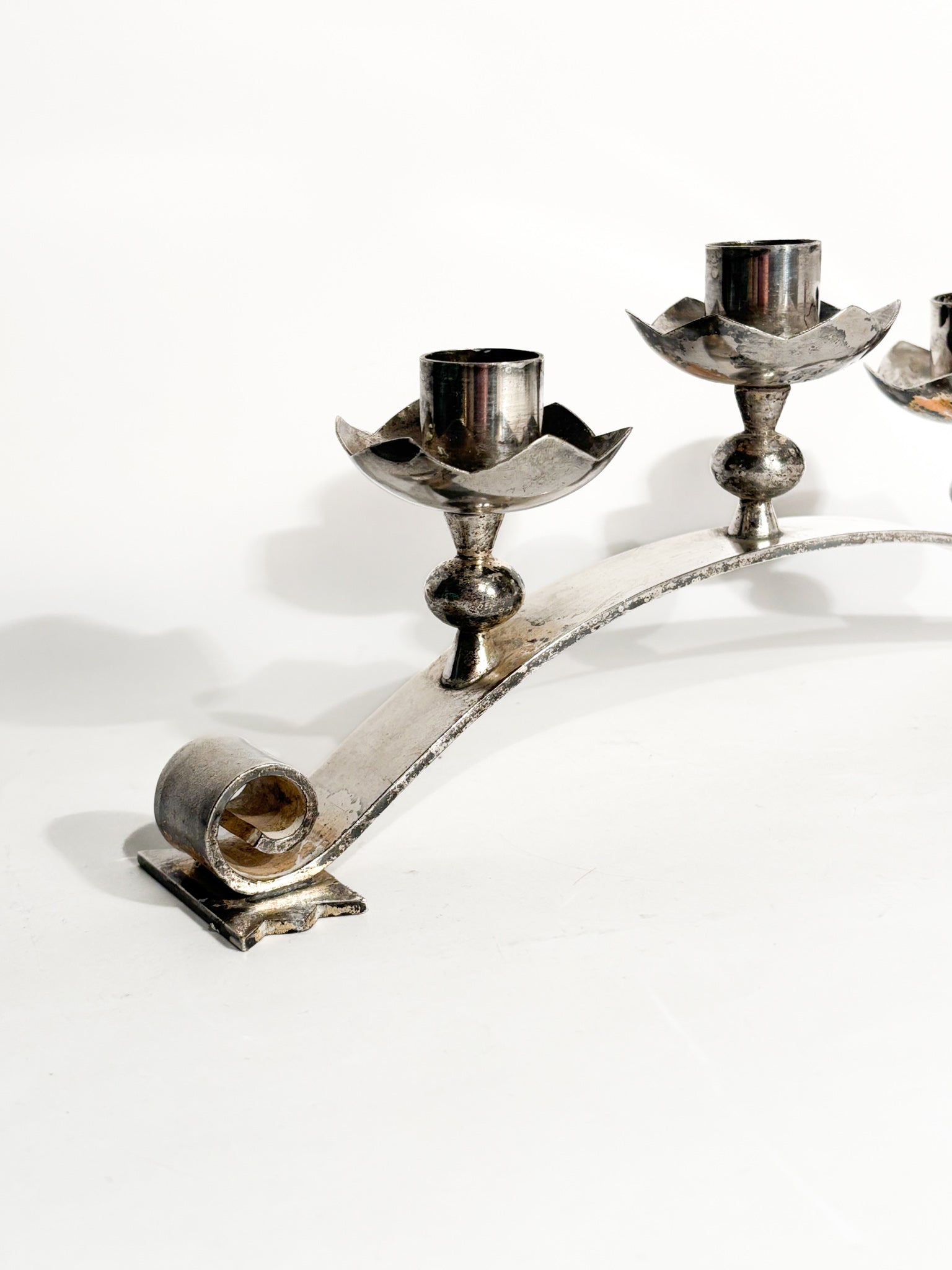 Portacandele triplo in metallo argentato, realizzato in Italia negli anni '50