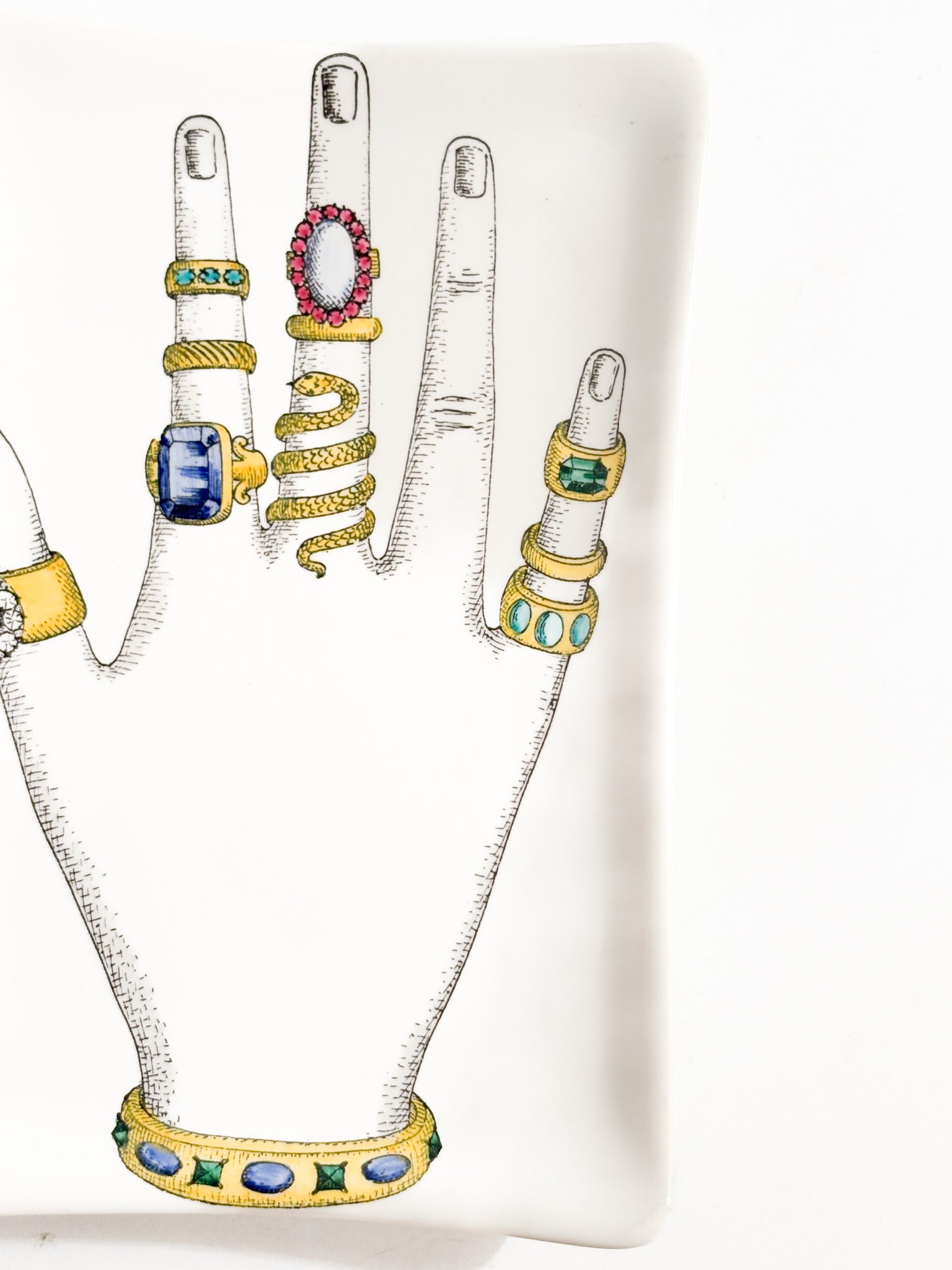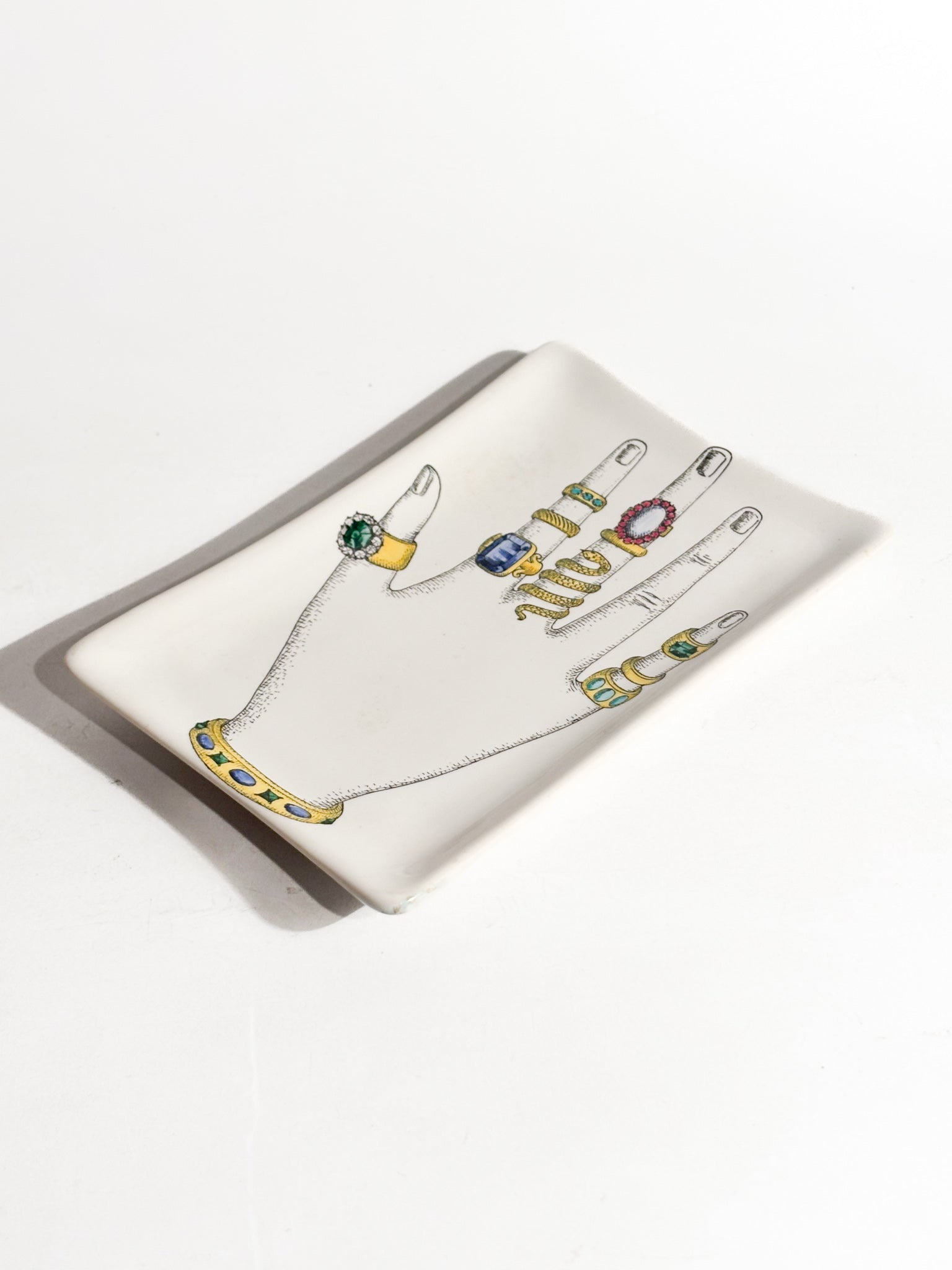 Il posacenere presenta la caratteristica grafica disegnata da Piero Fornasetti di una mano ornata da anelli e un bracciale colorato su sfondo bianco. È realizzato in porcellana di alta qualità decorata a mano a Milano, nell'Atelier Fornasetti. Può essere utilizzato sia come posacenere che come elegante vassoio decorativo o svuotatasche per piccoli oggetti. Eventuali leggere discrepanze tra articoli simili sono una caratteristica della produzione artigianale, che ne attesta l'unicità.