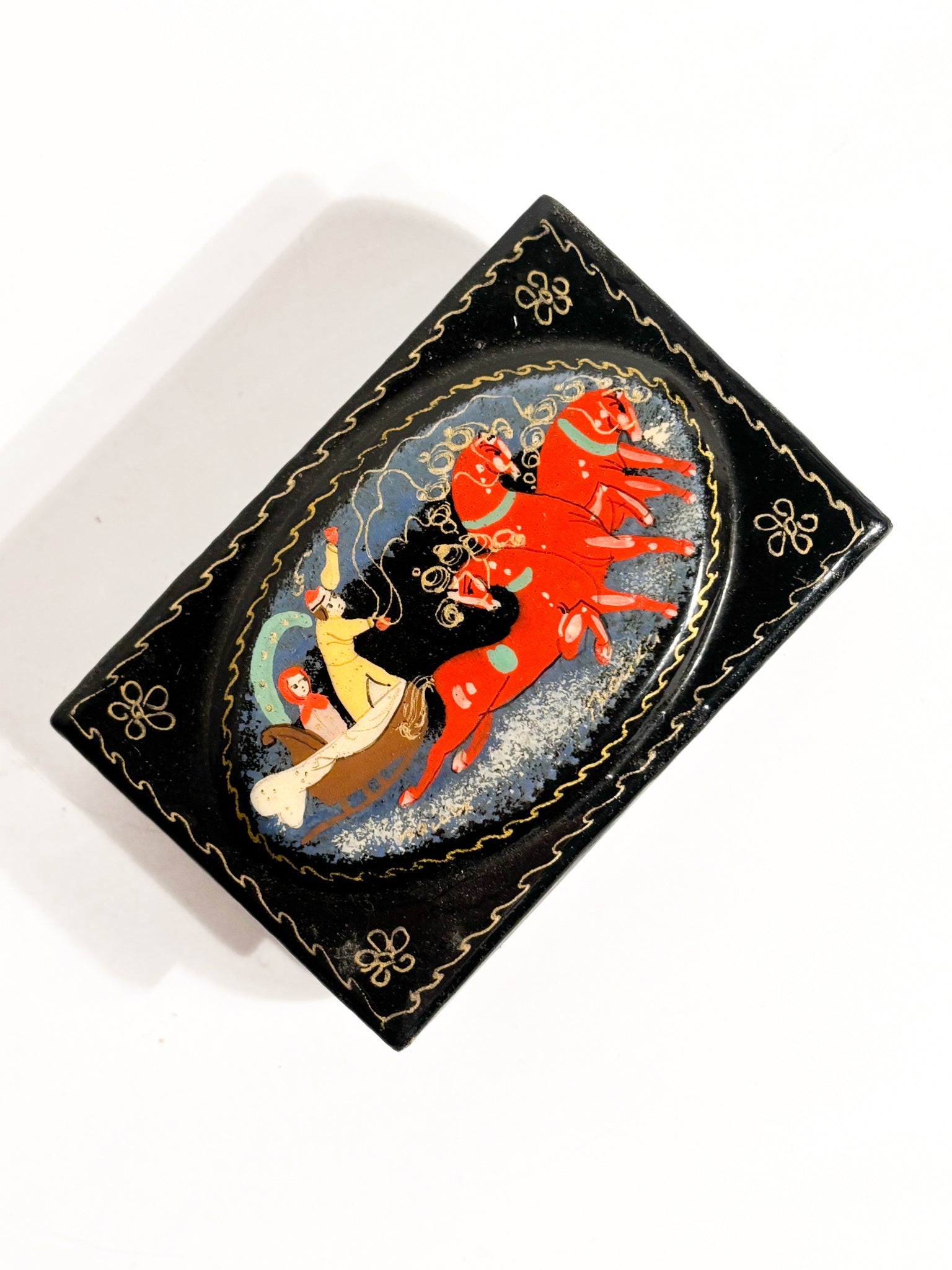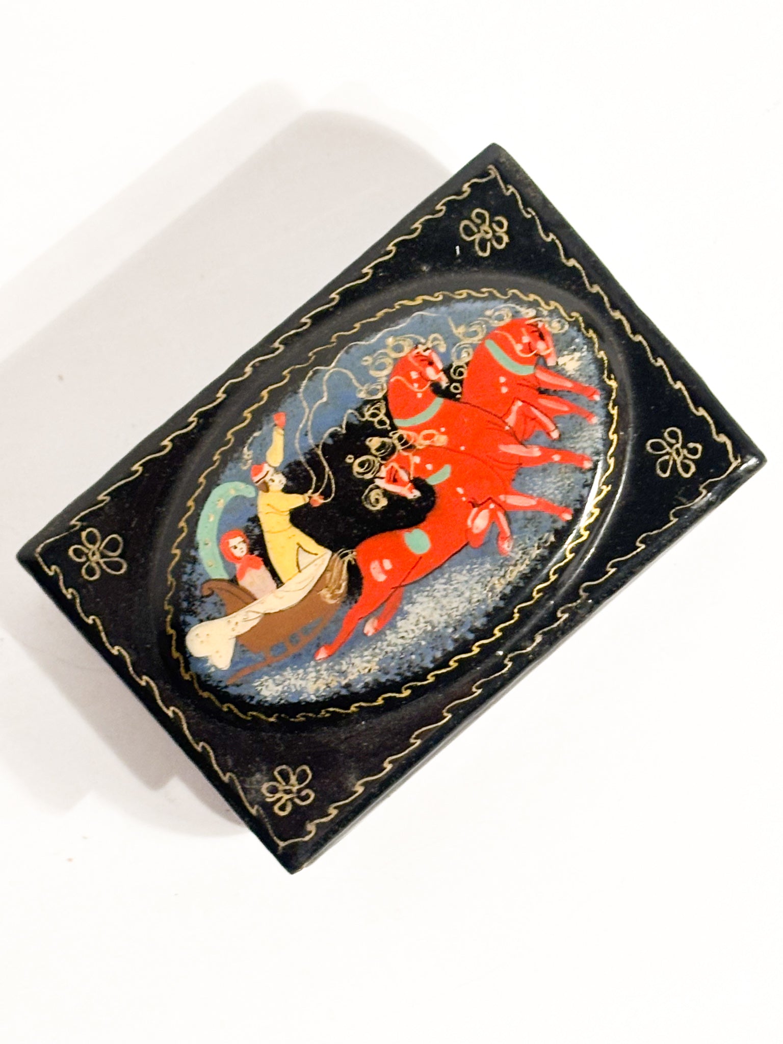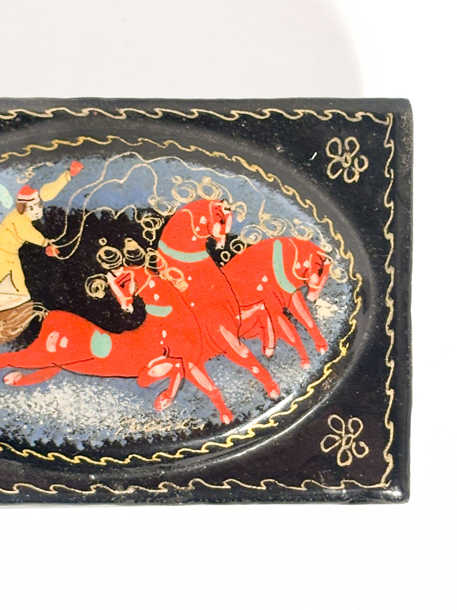 Scatola russa Palekh in cartapesta laccata, raffigurante tre cavalli che tirano una slitta, realizzata nel XX Secolo