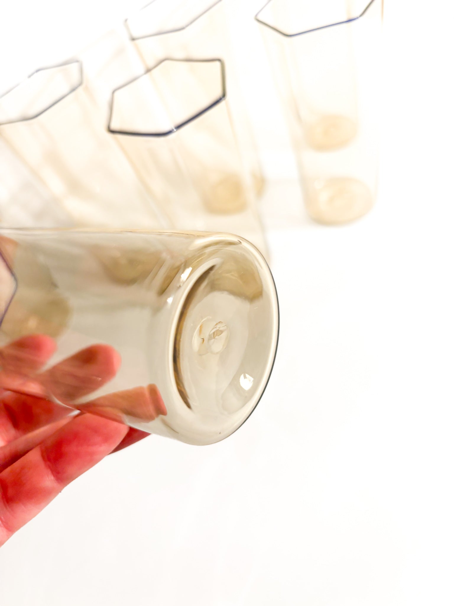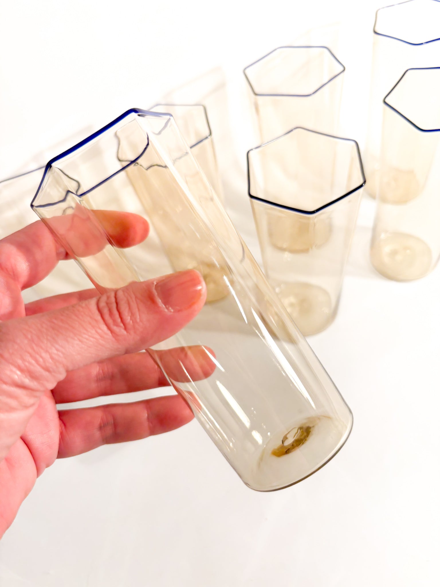 Set of six + one cylindrical glasses in hand-blown Murano glass, made by Carlo Scarpa for Venini in the 1930s
