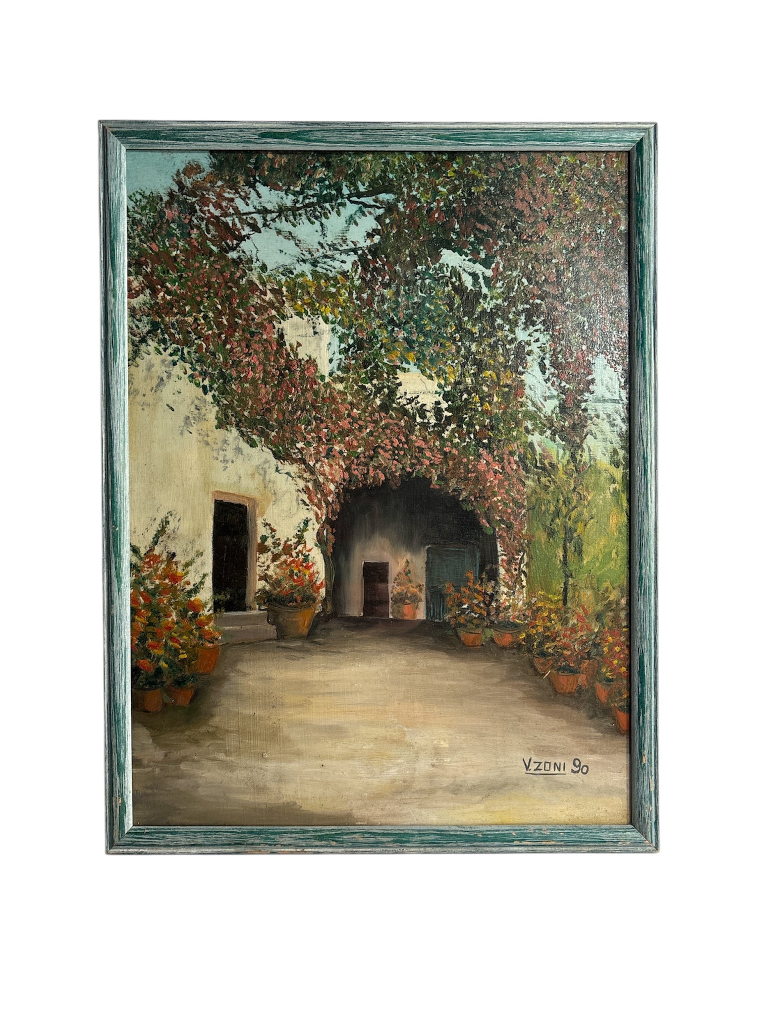 Oil painting on cardboard depicting a garden, created by V. Zoni in 1990.