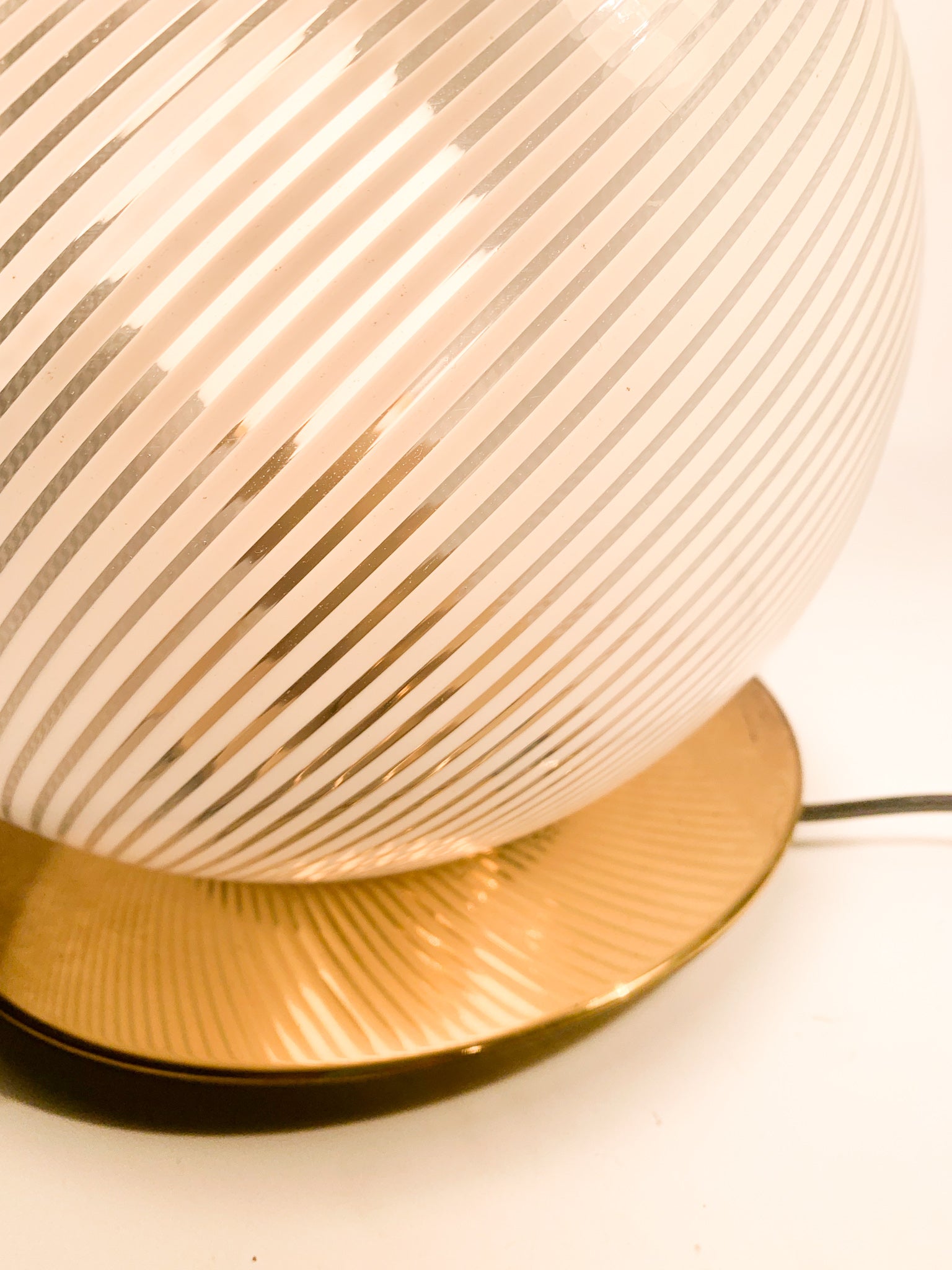 Lamp with spherical shape in Murano glass and brass base, with spiral barrel workmanship, made in the 1960s