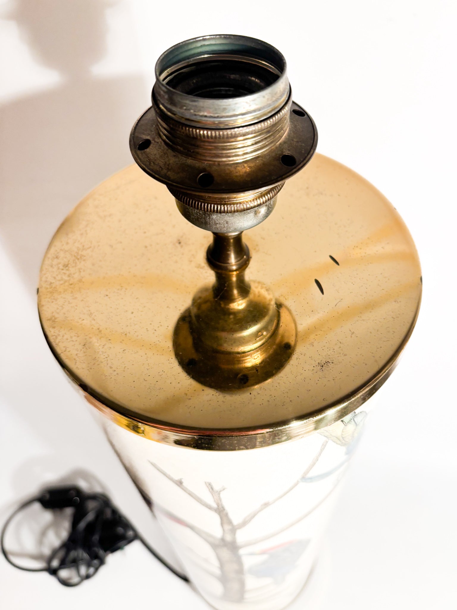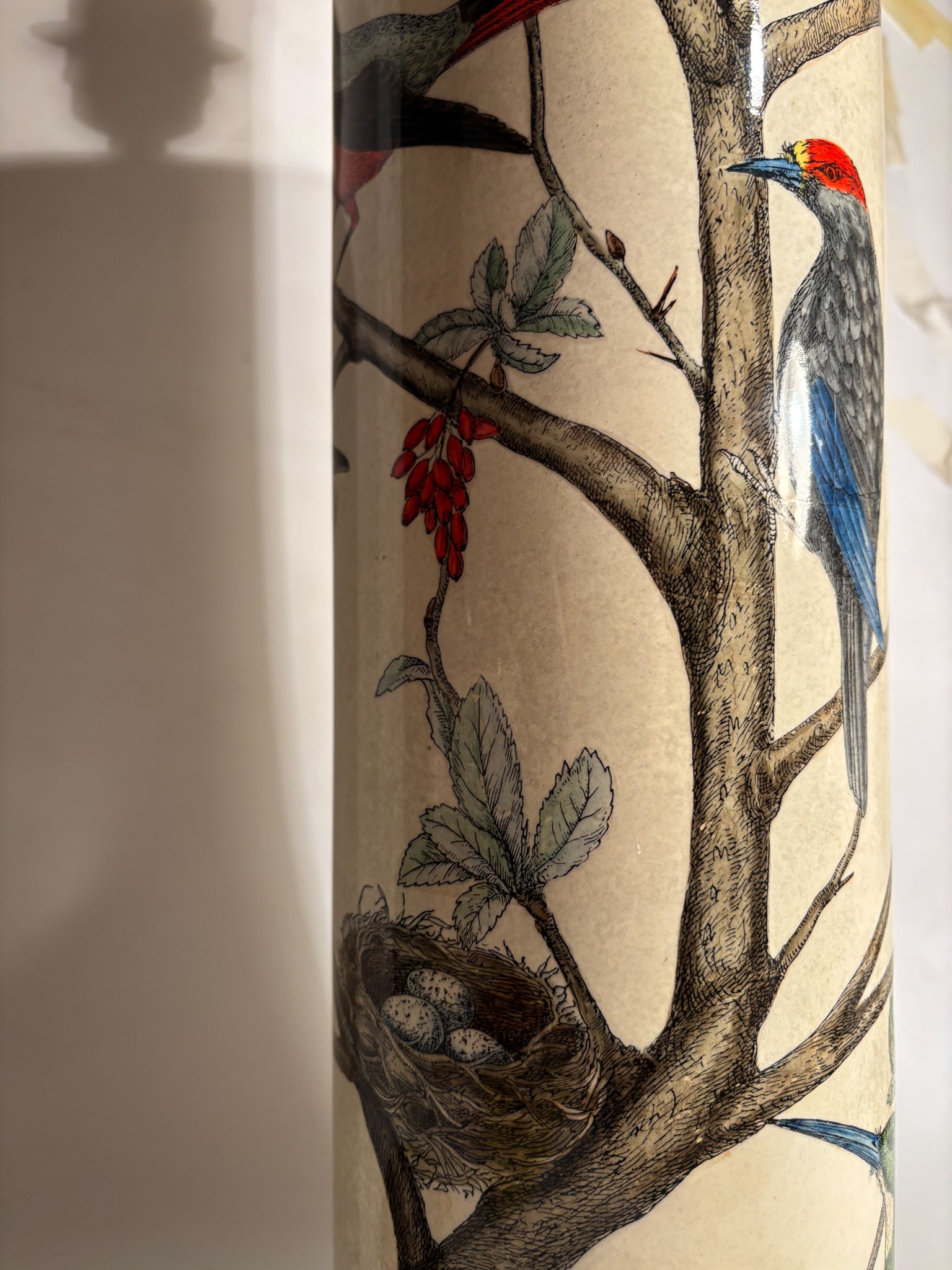 La struttura cilindrica è in metallo e ottone, decorata con motivo di uccelli policrome eseguito attraverso litografia retrostampata. Marcata alla base.