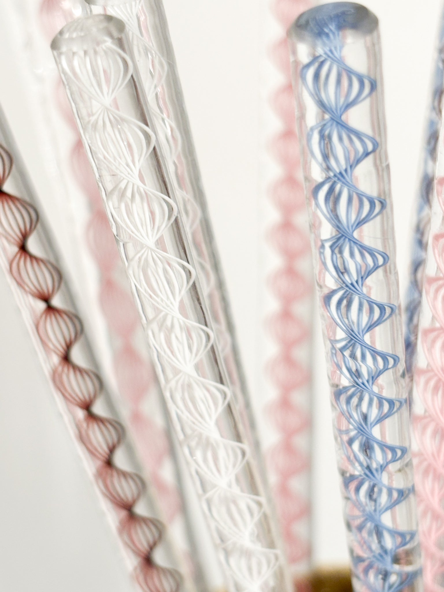Set da dodici bastoncini per cocktail in vetro di Murano soffiato a mano, con lavorazione a filigrana, realizzati da Venini negli anni '80. Il set è dotato di scatola originale.