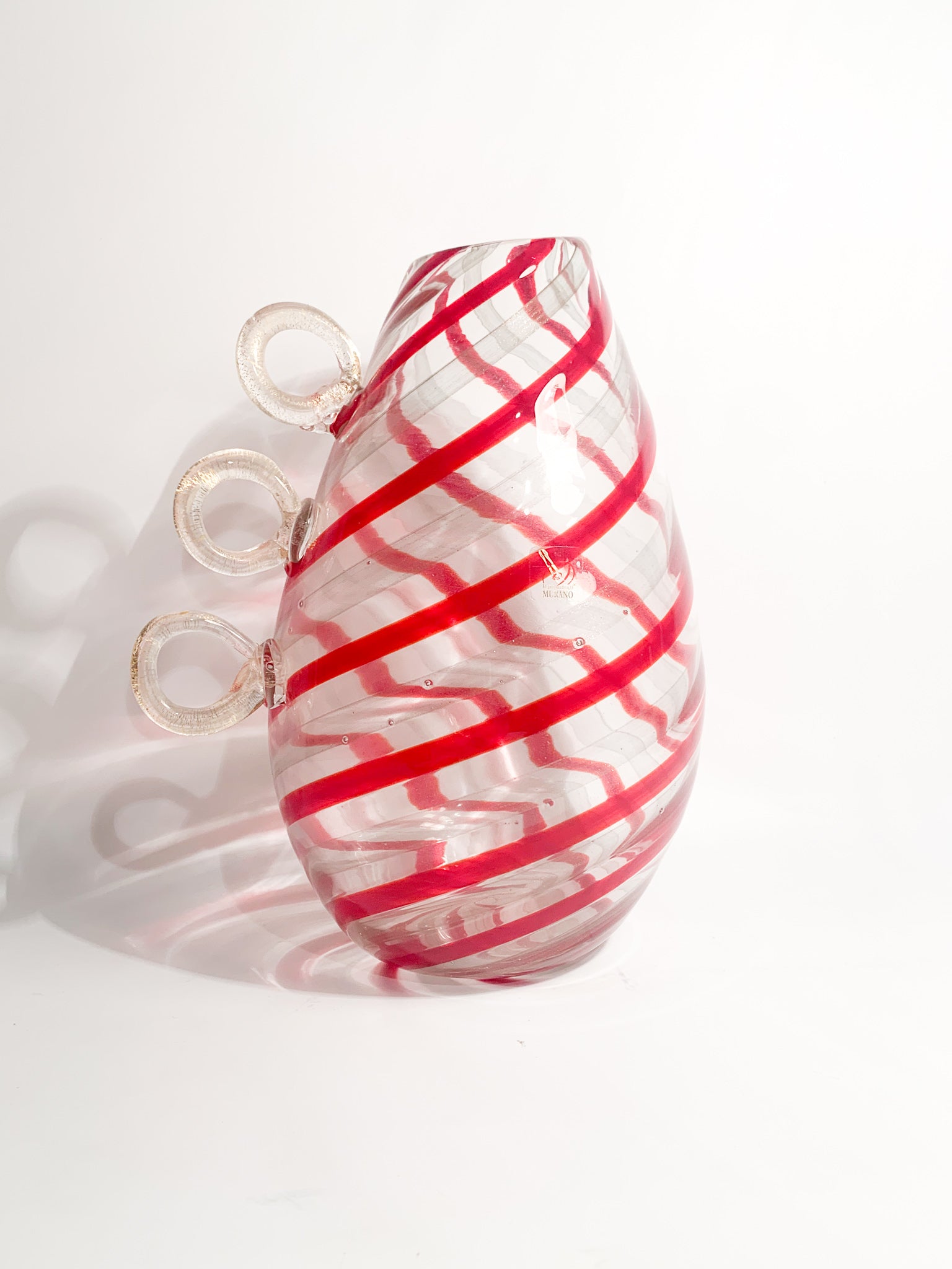 Vaso in vetro di Murano trasparente e rosso, con tre anse con foglia d'oro, realizzato con la tecnica a spirale negli anni '80. Etichettato Vetro Artistico Murano.