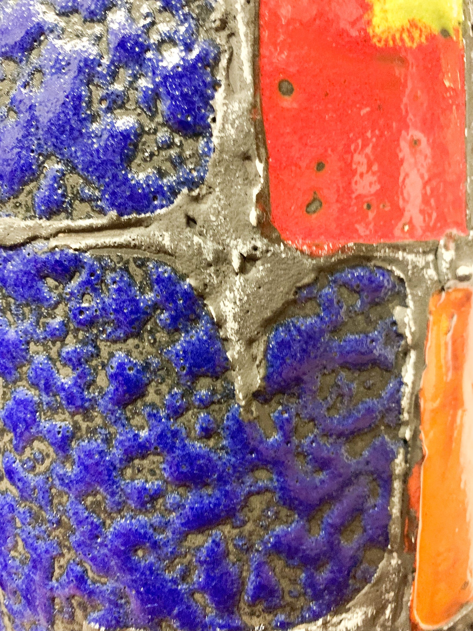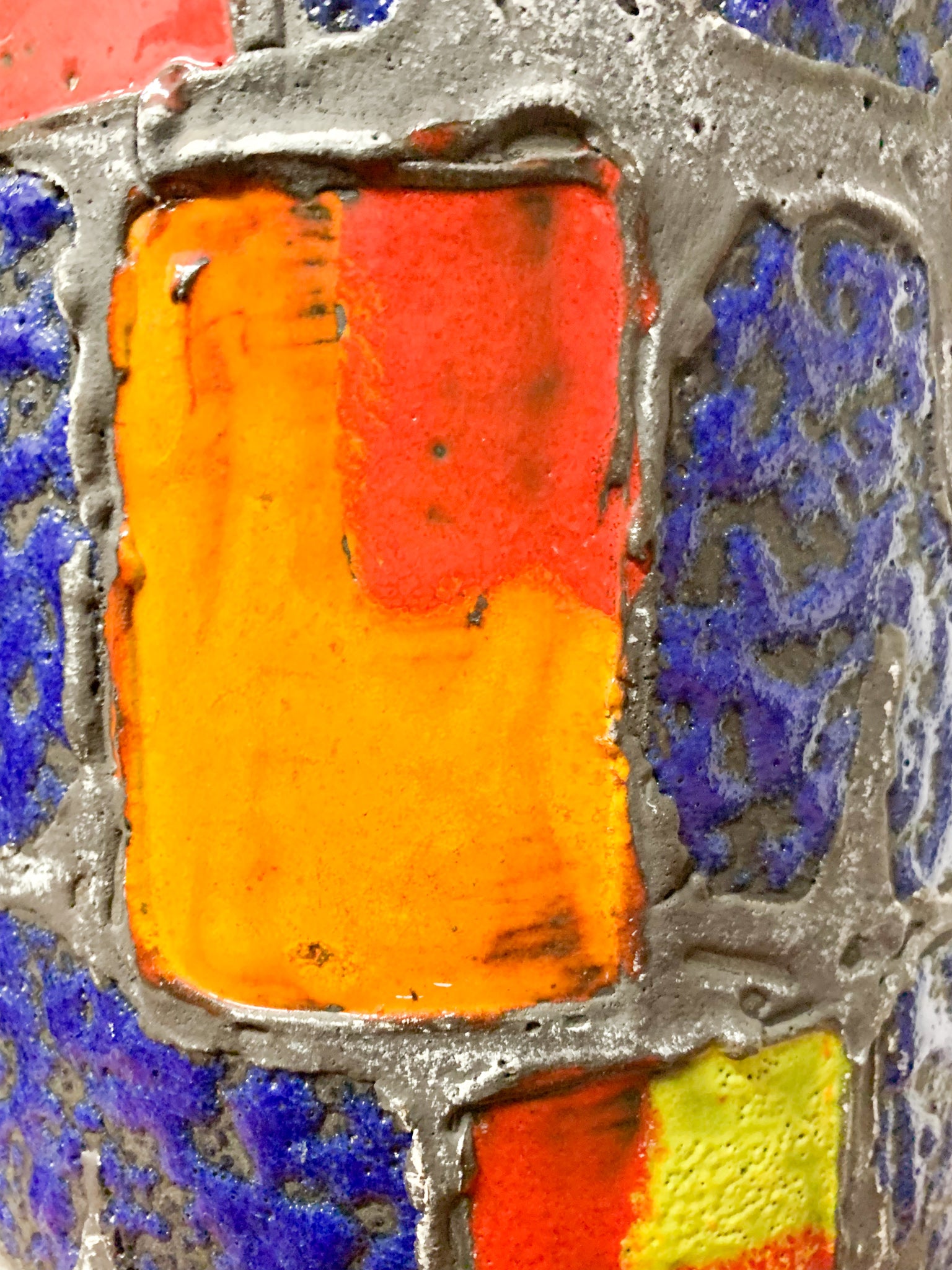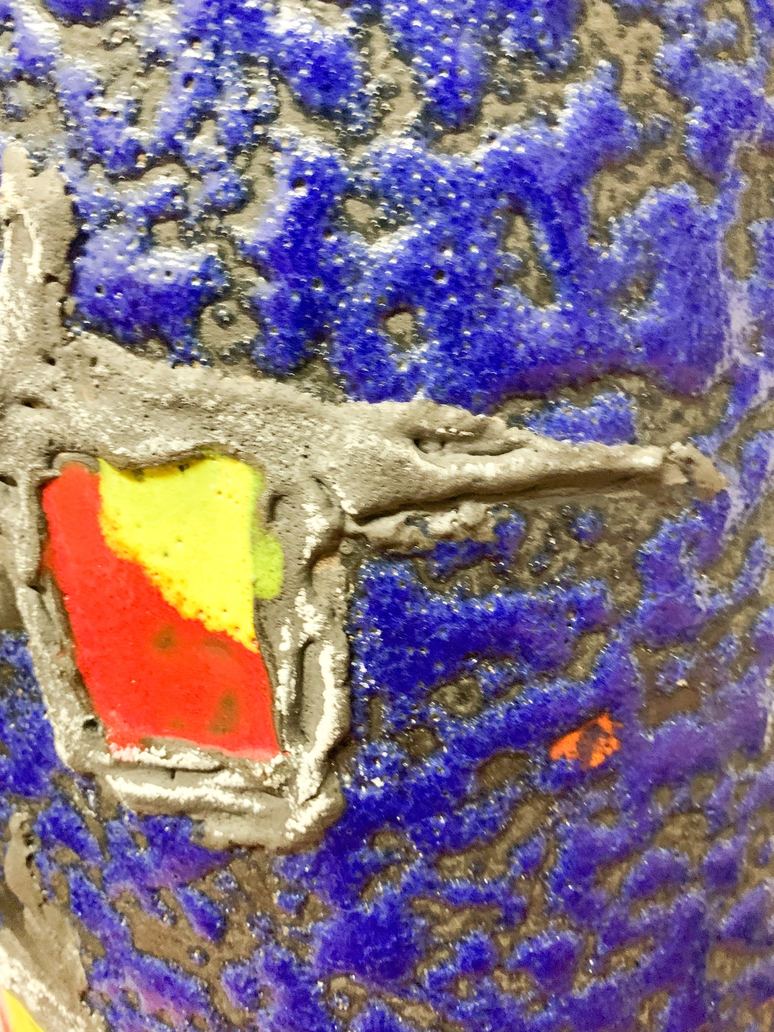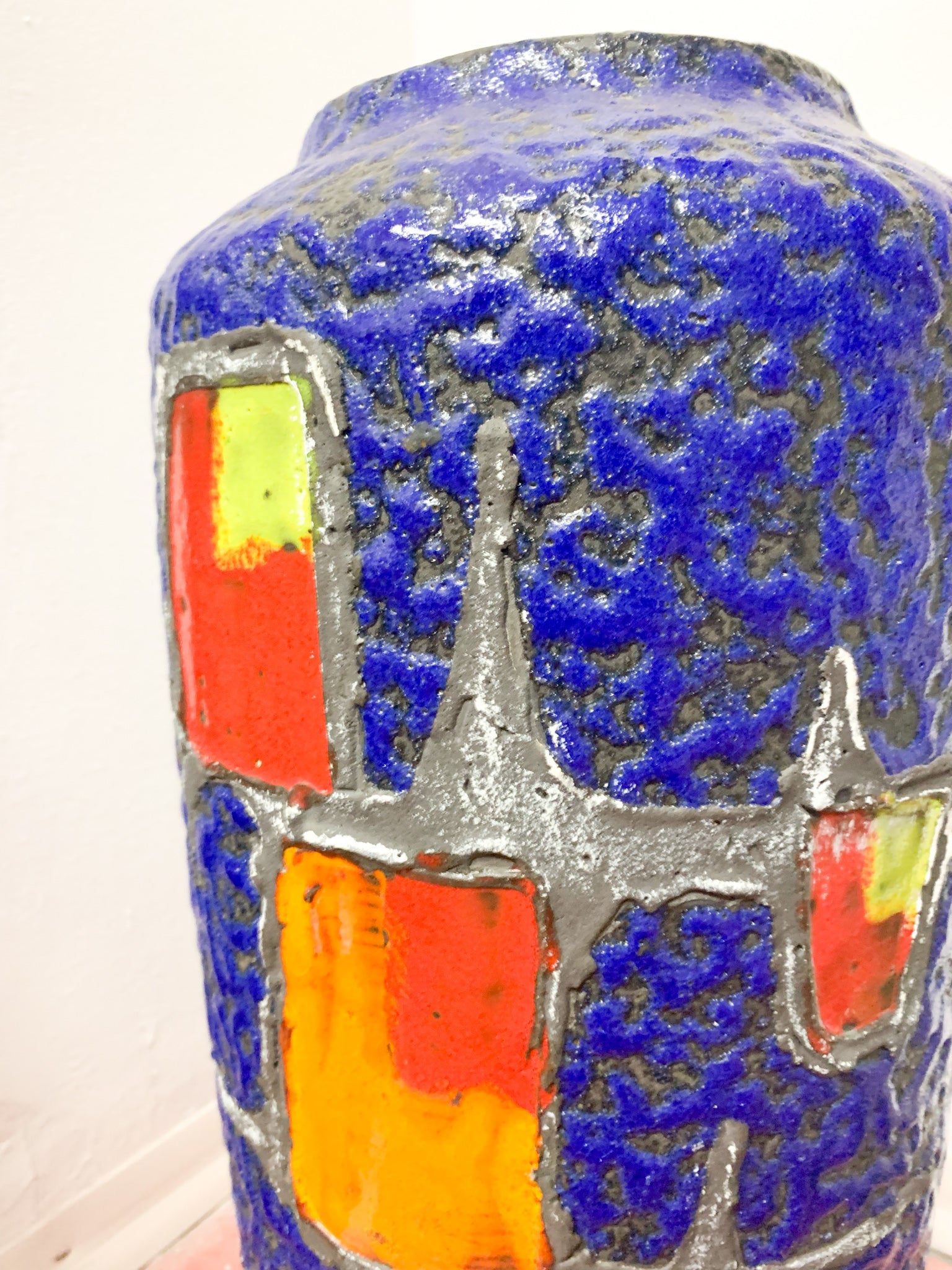 Portaombrelli o vaso da pavimento in ceramica di Albisola, dipinto a mano e realizzato negli anni 70, nei colori del blu, giallo e arancione.