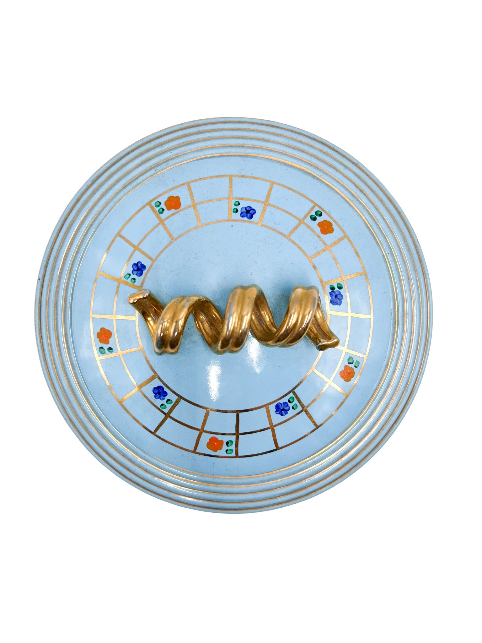 Potiche di ceramica azzurra con decorazioni dorate, realizzata da Pucci Umbertide negli anni '50