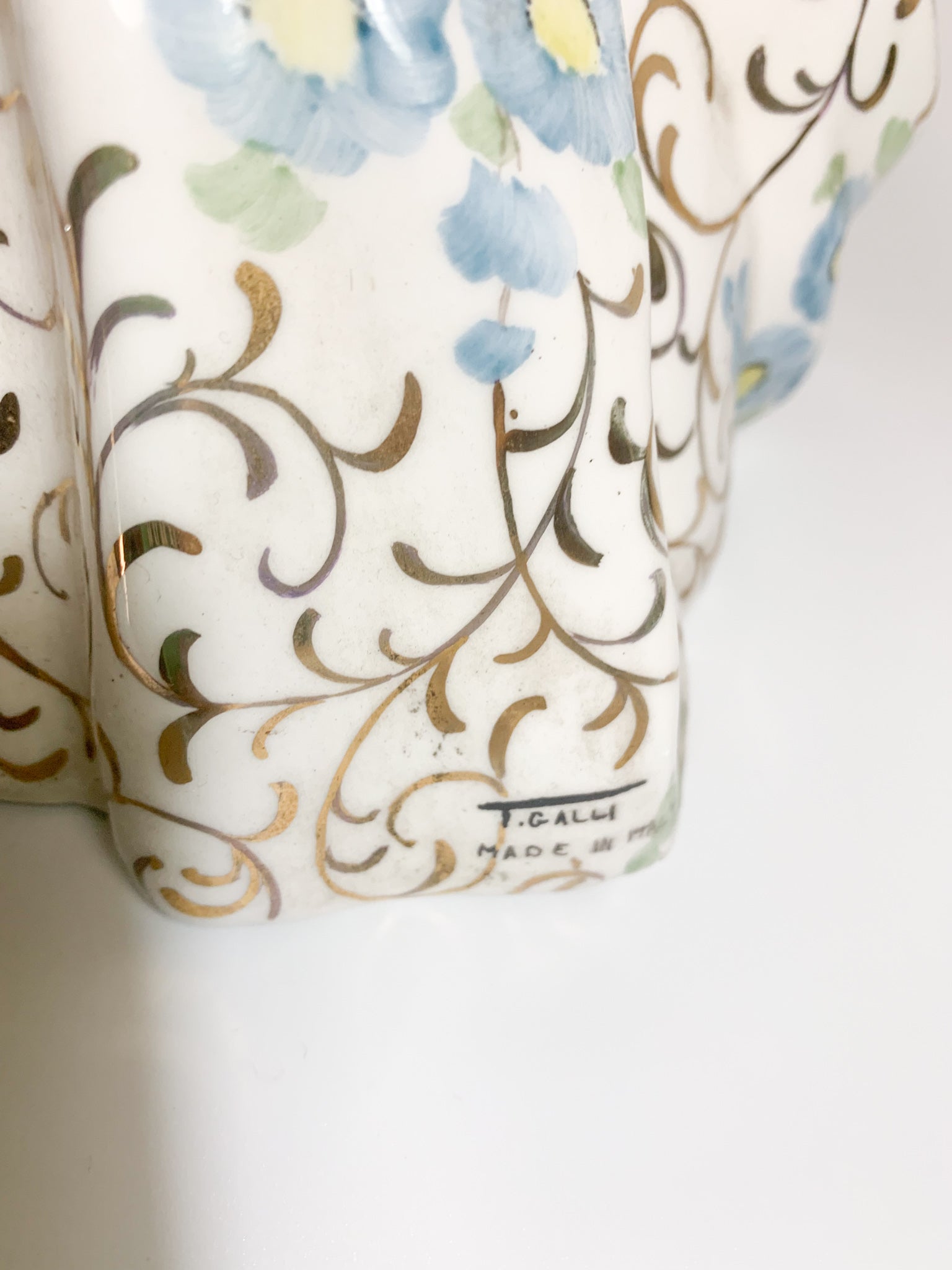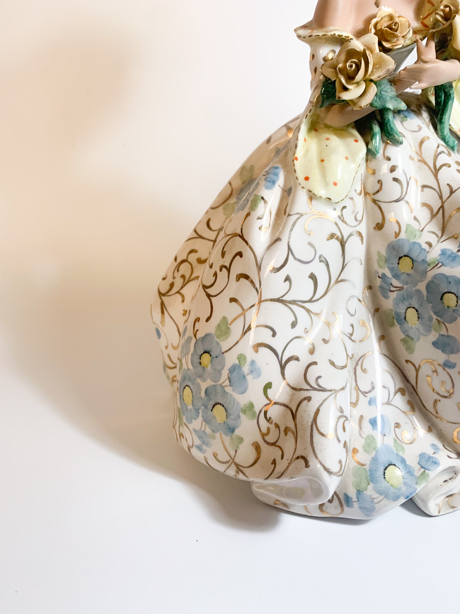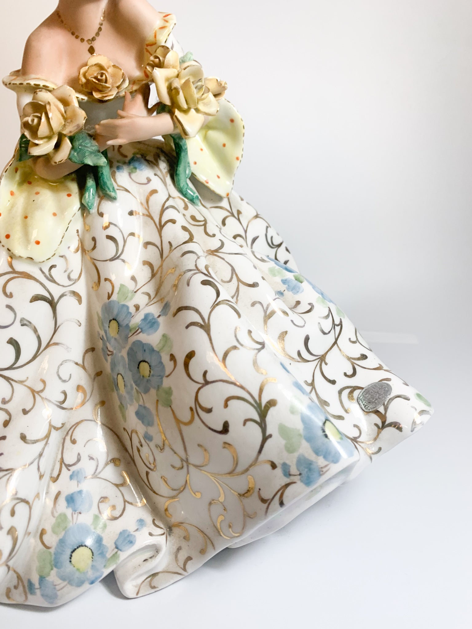 Scultura in ceramica italiana di dama con abito fiorato, realizzata da Tiziano Galli negli anni '50. Le pieghe della gonna sono state realizzate in iridescenza.