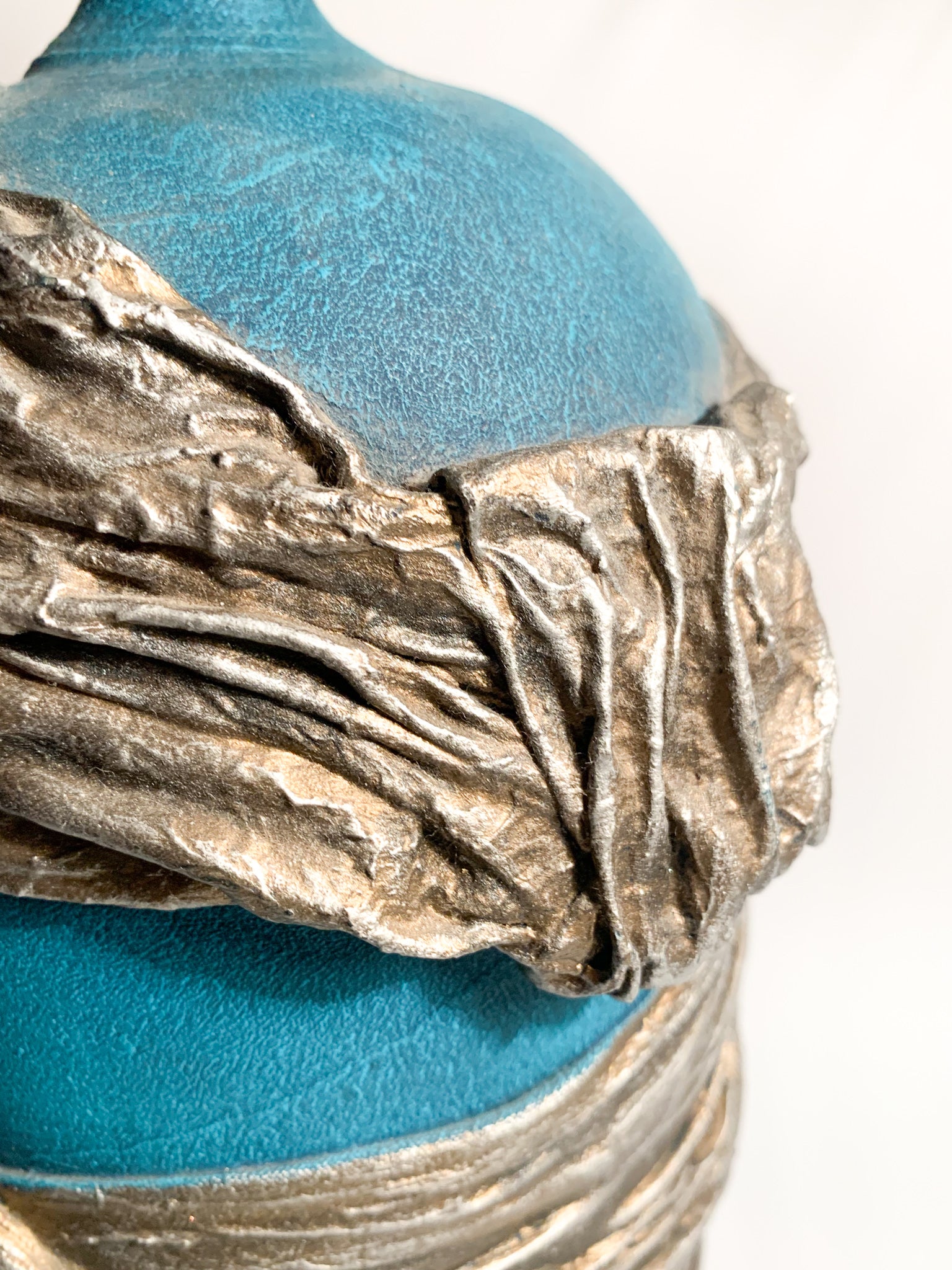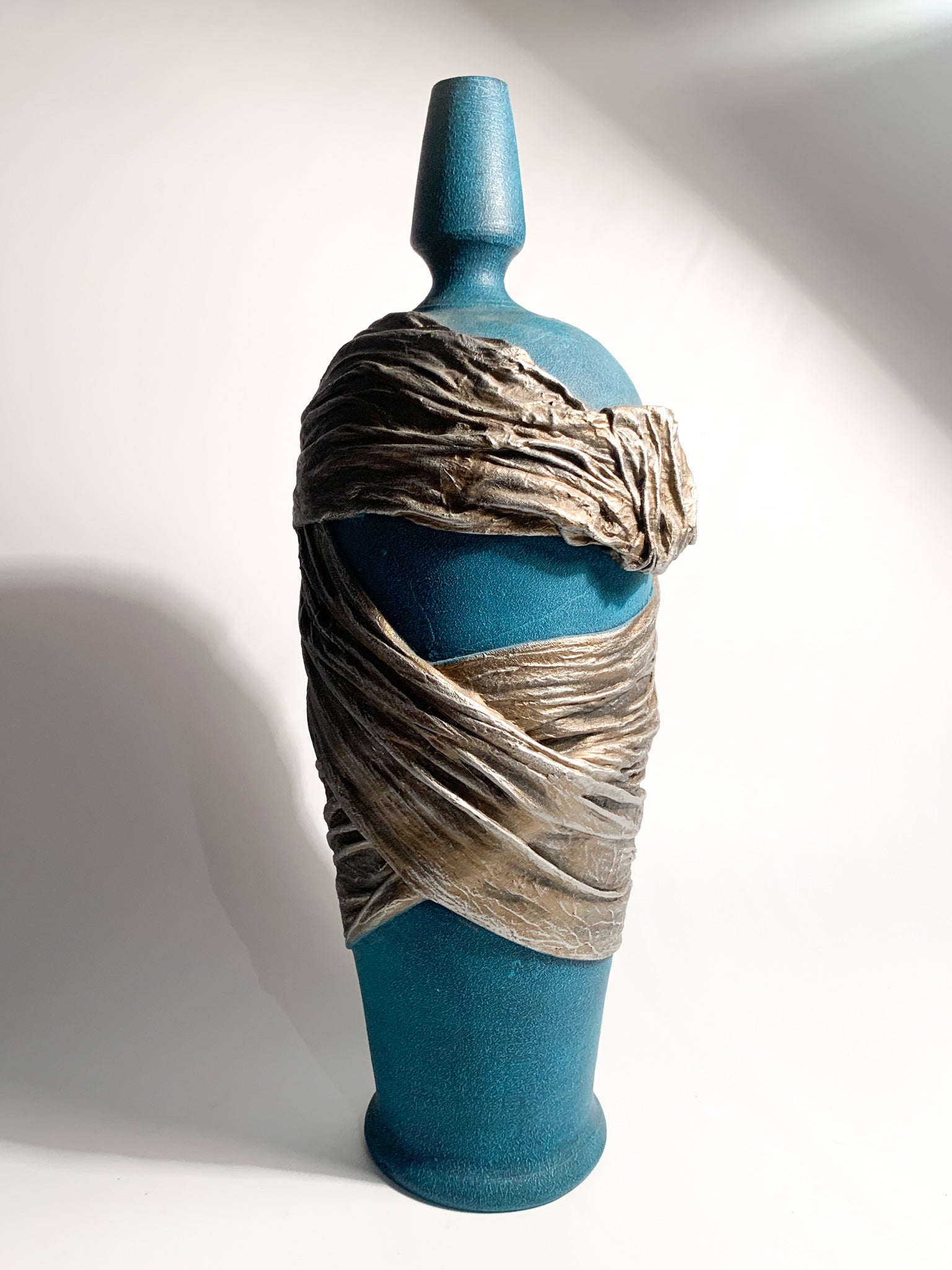 Vaso in ceramica blu con nastro bianco, realizzato da Zaccagnini negli anni '50