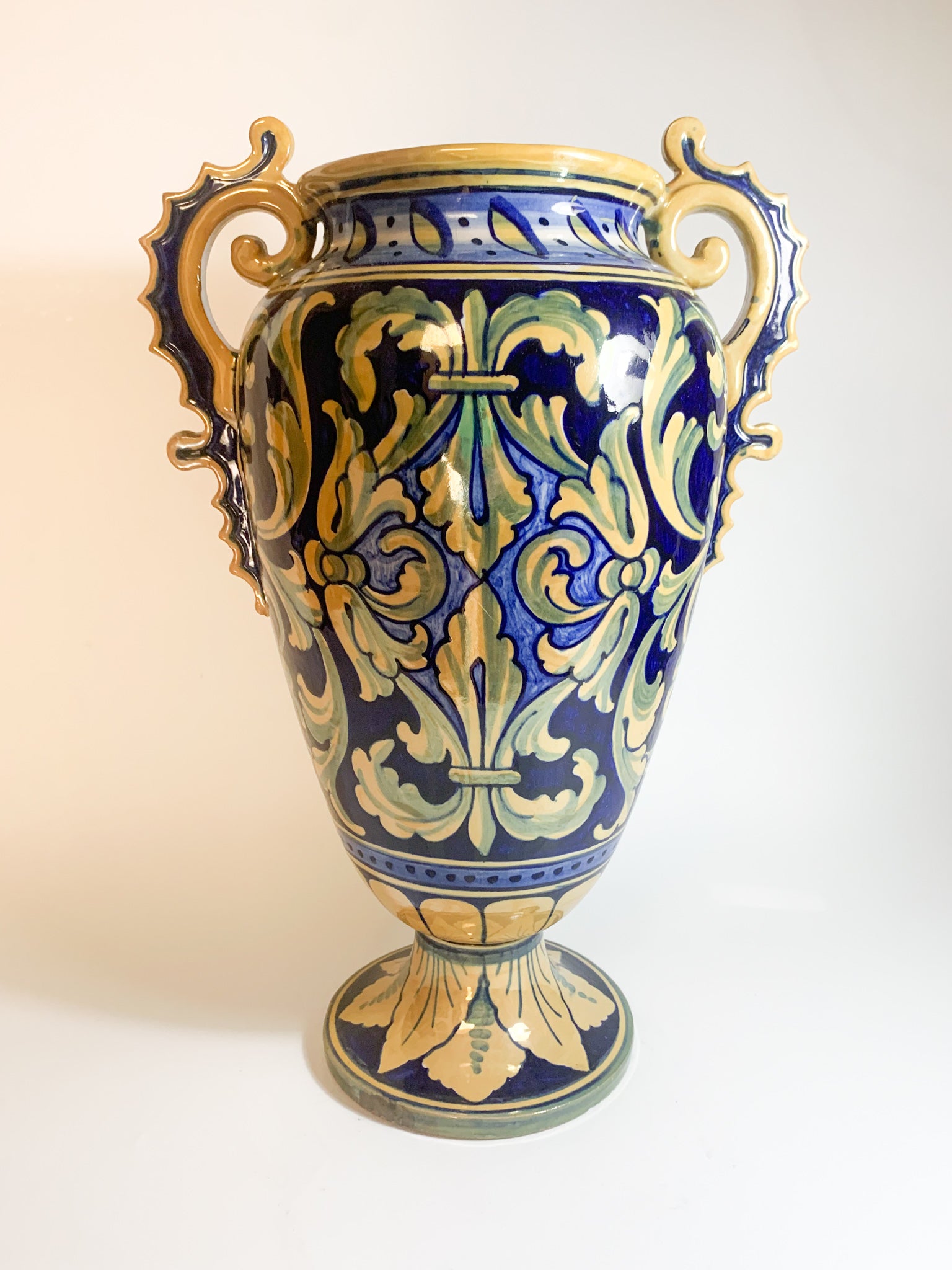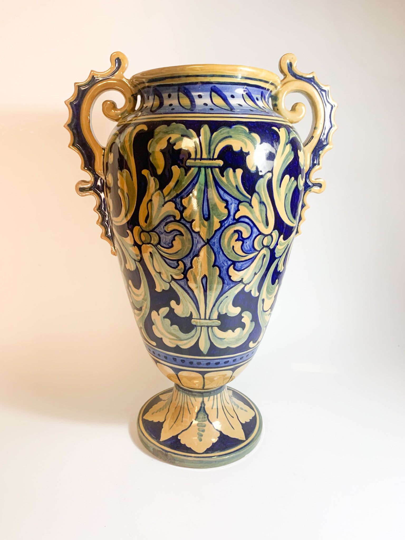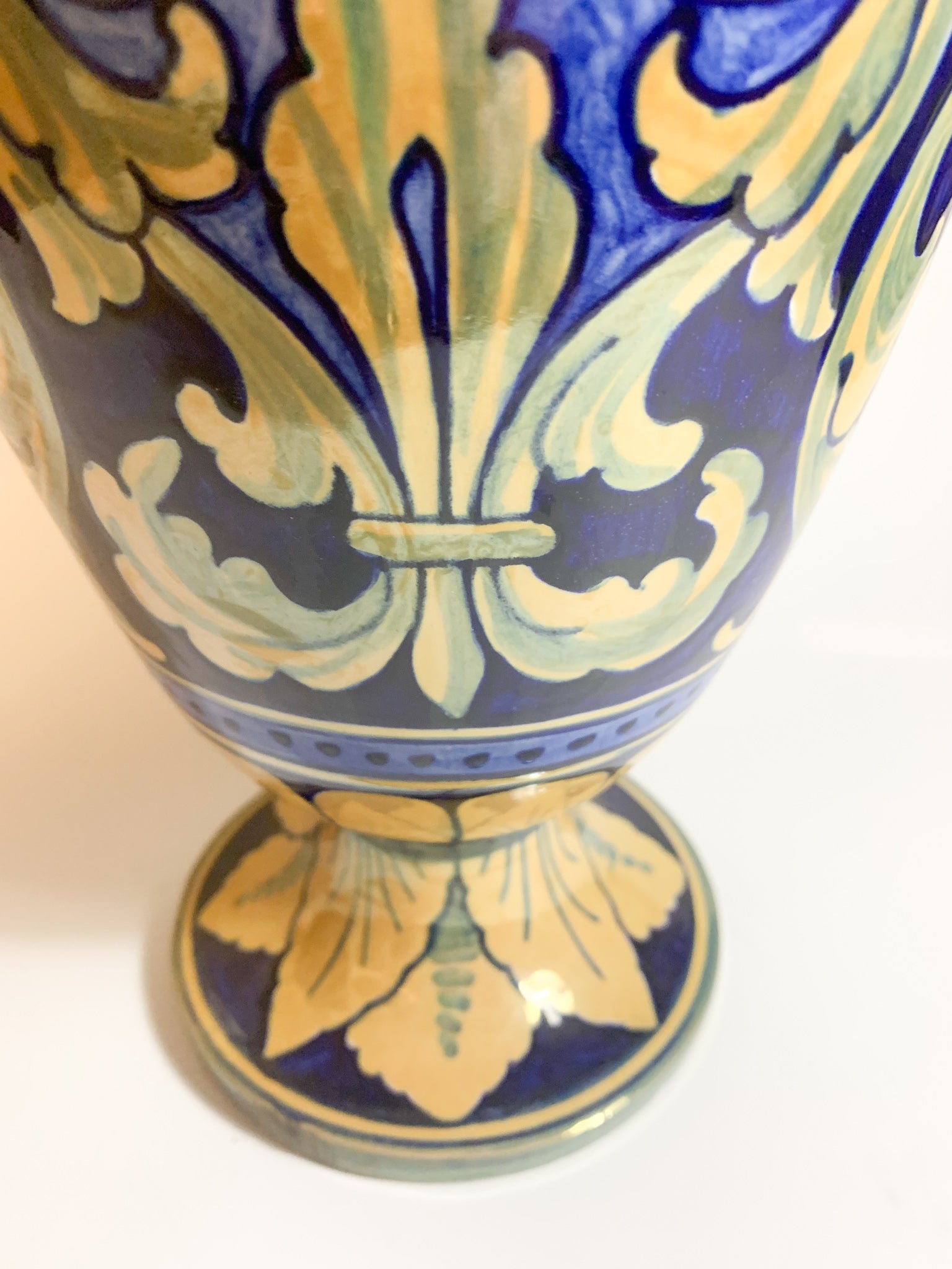 Vaso in Ceramica dipinto a mano blu e giallo iridescente, realizzato da Gualdo Tadino negli anni '50